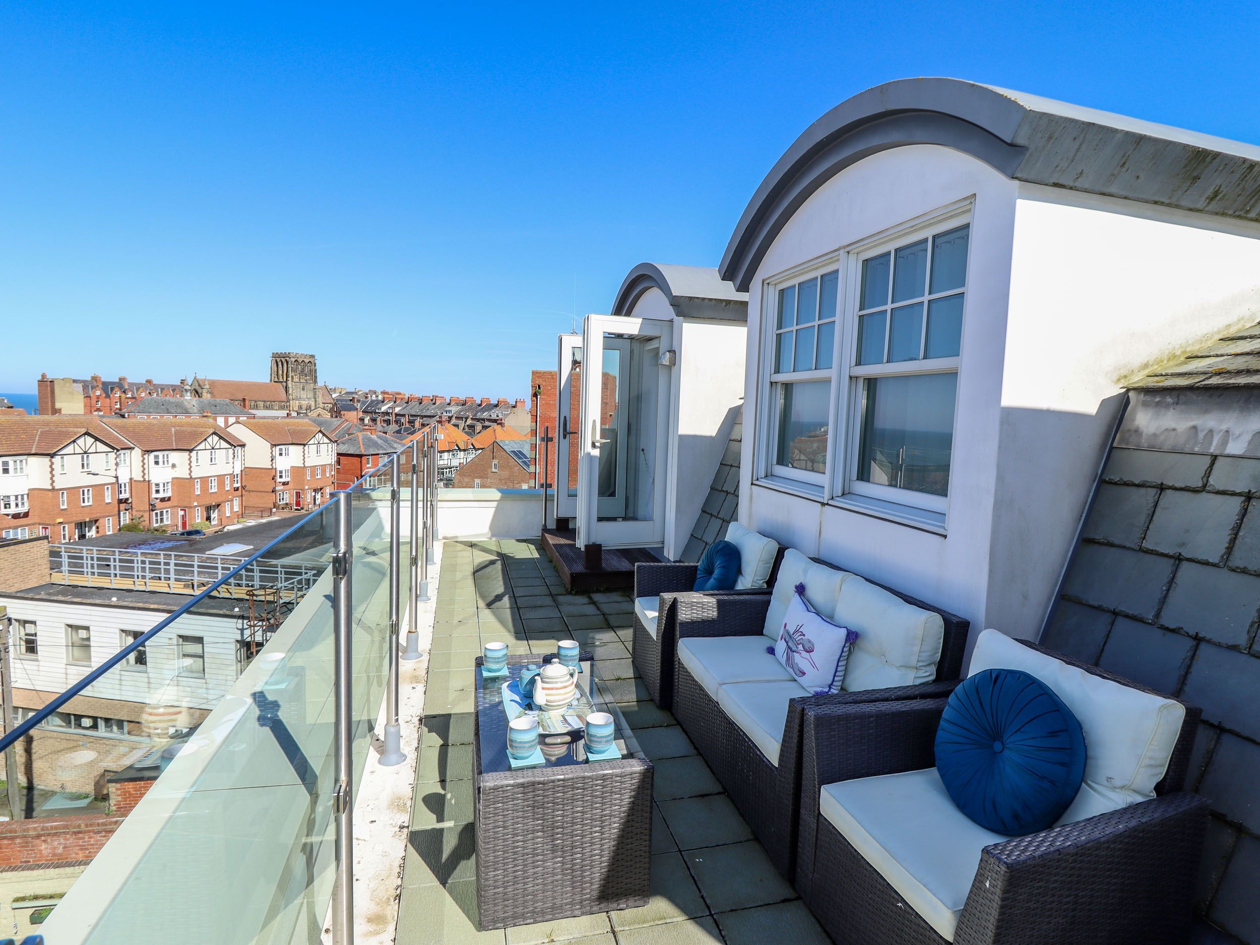 Accomodation Details Penthouse apartment with lift. Two bedrooms: 1 x twin room, 1 x double. Bathroom with bath, shower over, basin and WC. Open-plan living space with kitchen, dining and sitting area. Balcony with superb views over Whitby. Designated parking for one car