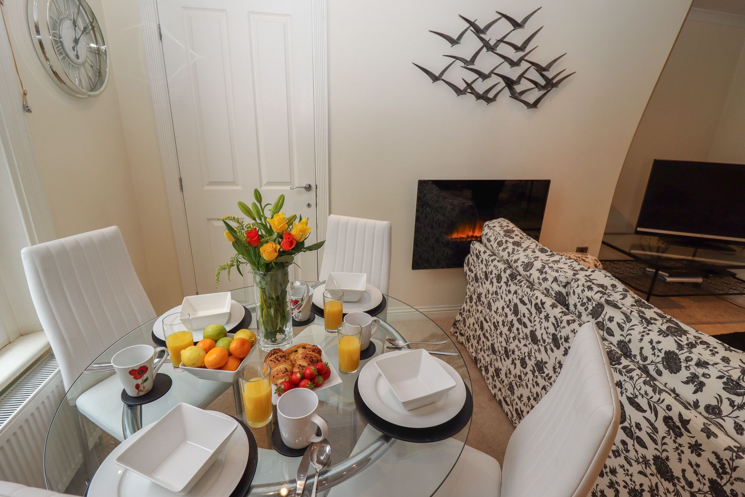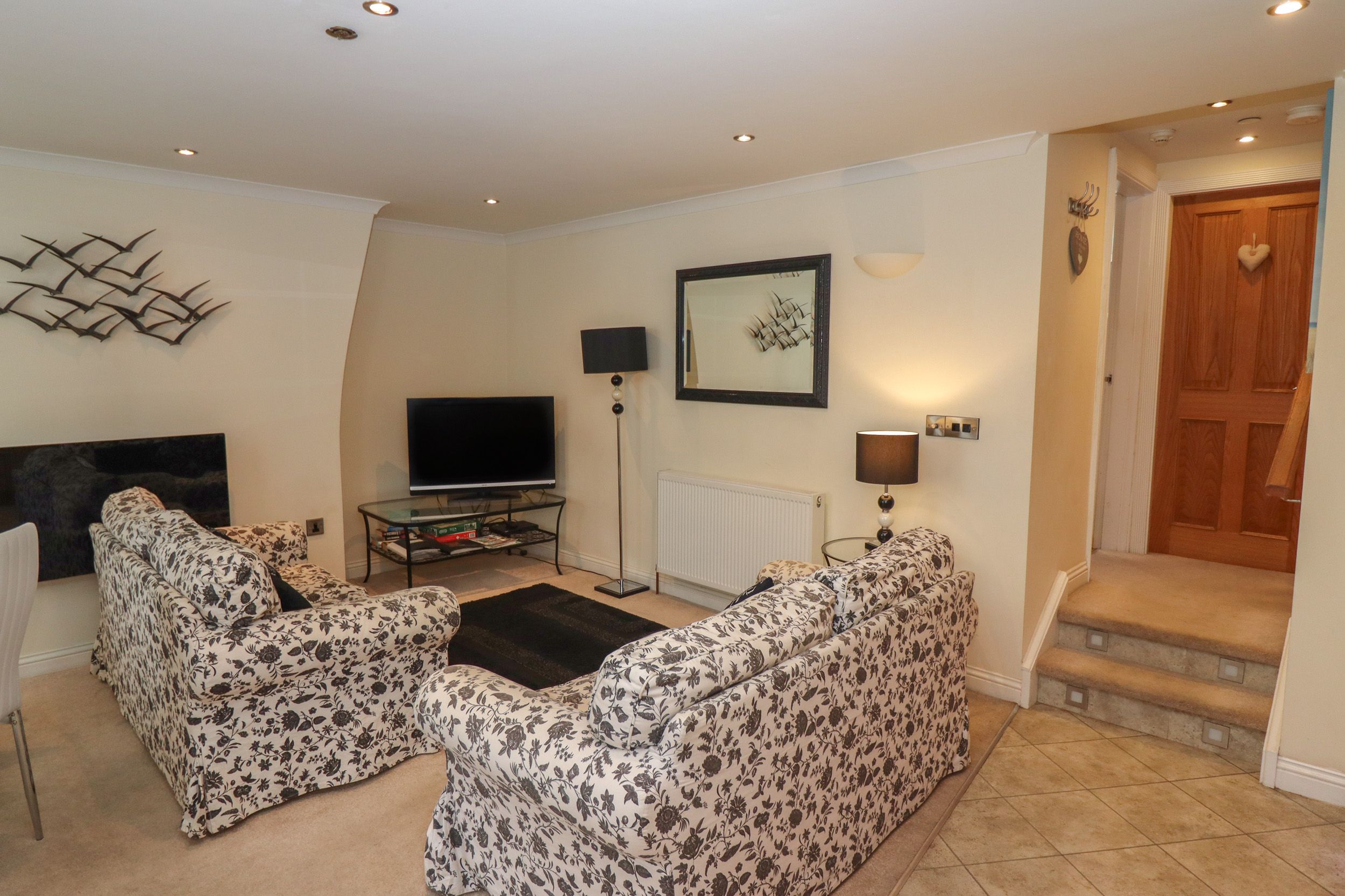 Accomodation Details Ground-floor apartment. Two bedrooms: 1 x double with TV, 1 x twin with TV. Shower room with walk-in shower, basin, heated towel rail and WC. Open-plan living space with kitchen, dining area, and sitting area with electric fire