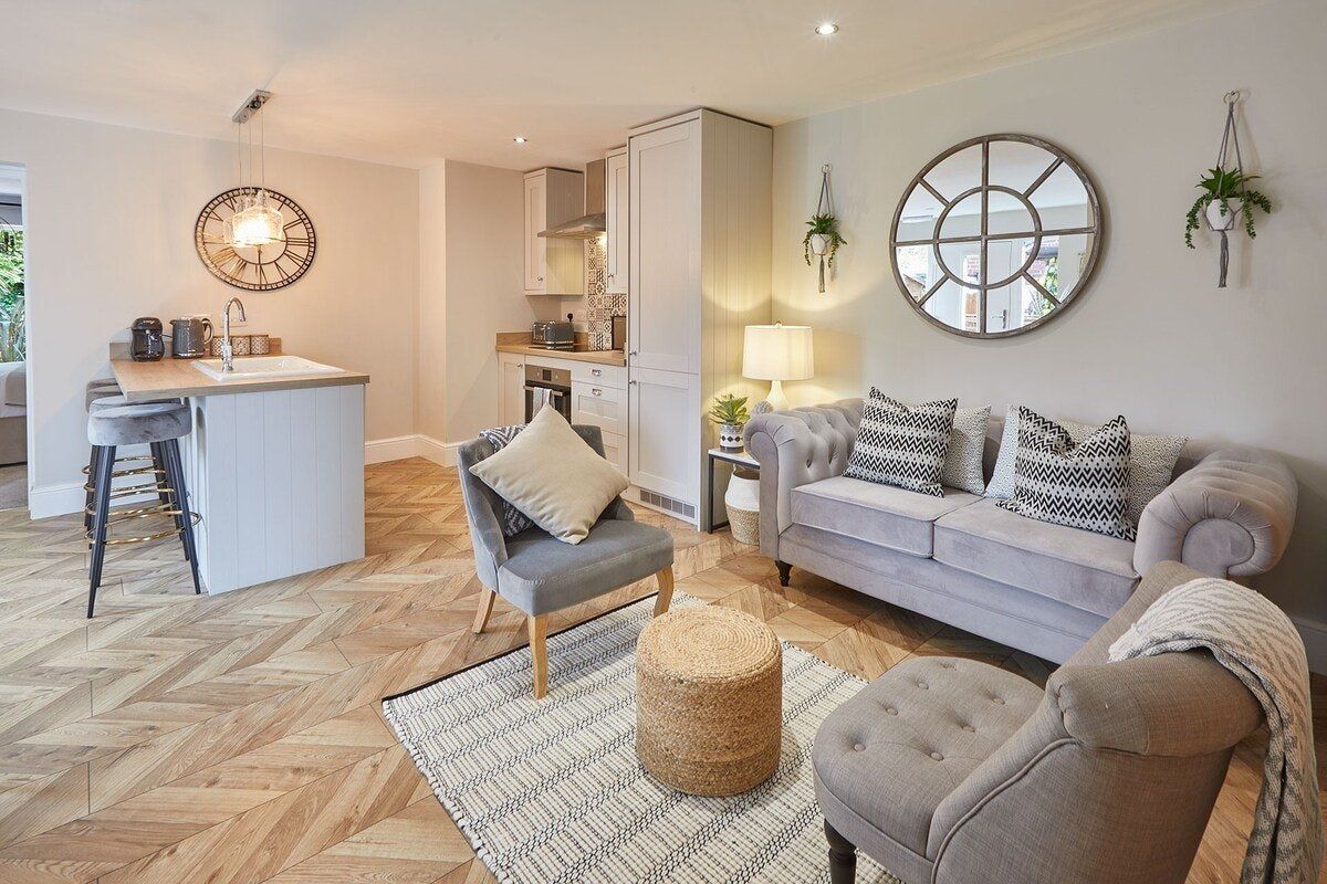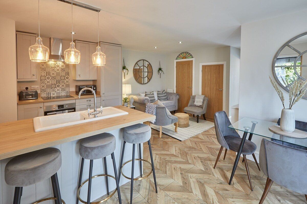 This modern, ground-floor apartment has a real boutique hotel feel to it. On entering you'll step directly into a spacious open-plan living area, flooded with light and adorned with elegant furniture that doesn't compromise on comfort. A gorgeous patio at the back provides a private and peaceful setting to enjoy a drink when the sun is shining or a coffee in the fresh air each morning. With two equally stunning bedrooms, complete with king-size beds, it's the perfect home for some friends or a small family to enjoy a break by the sea. The centre of Whitby and the harbour are around fifteen minutes away on foot, so you have some of the best fish and chips in the country within easy reach – not to mention the cosy pubs and antique shops. A twenty-minute walk will bring you up to the iconic Whitby Abbey, famous for inspiring Bram Stoker's Dracula, and the town is also a fantastic base from which to explore the rugged North York Moors.