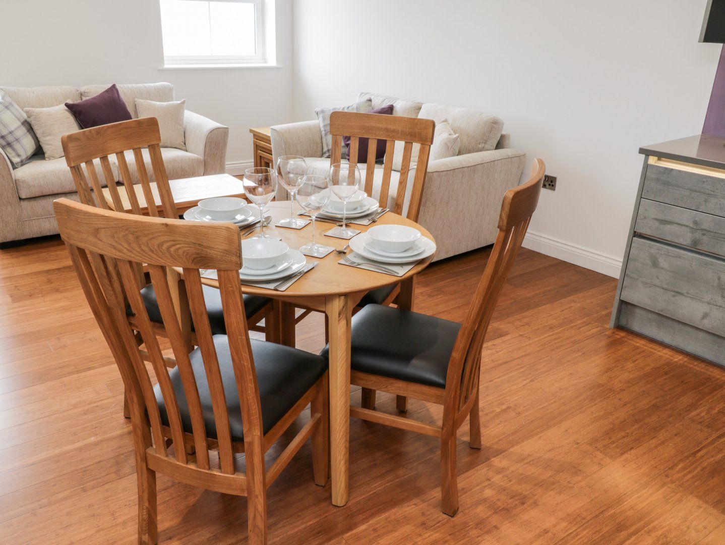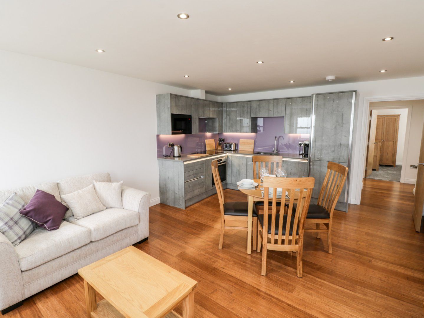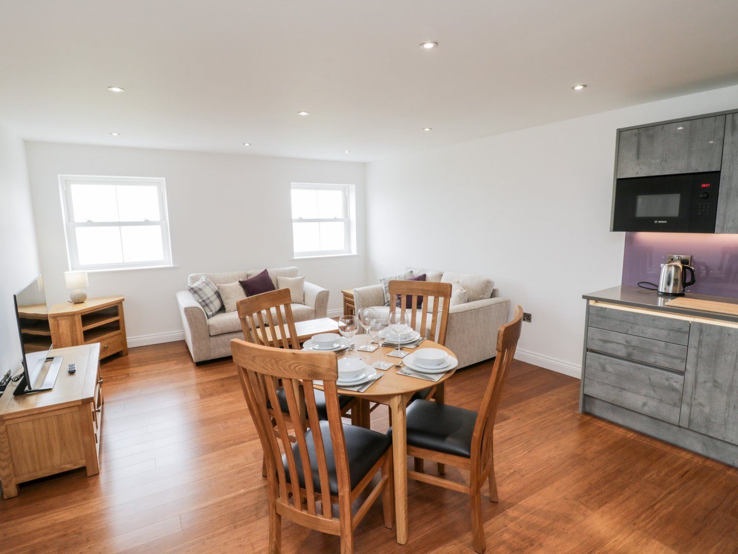 Accomodation Details Third-floor, apartment 14. Lift available. Two bedrooms: 1 x double with Smart TV and en-suite walk-in shower, basin, heated towel rail and WC, 1 x twin with Smart TV. Shower room with walk-in shower, basin, heated towel rail and WC. Open-plan living space with kitchen, dining area and sitting area