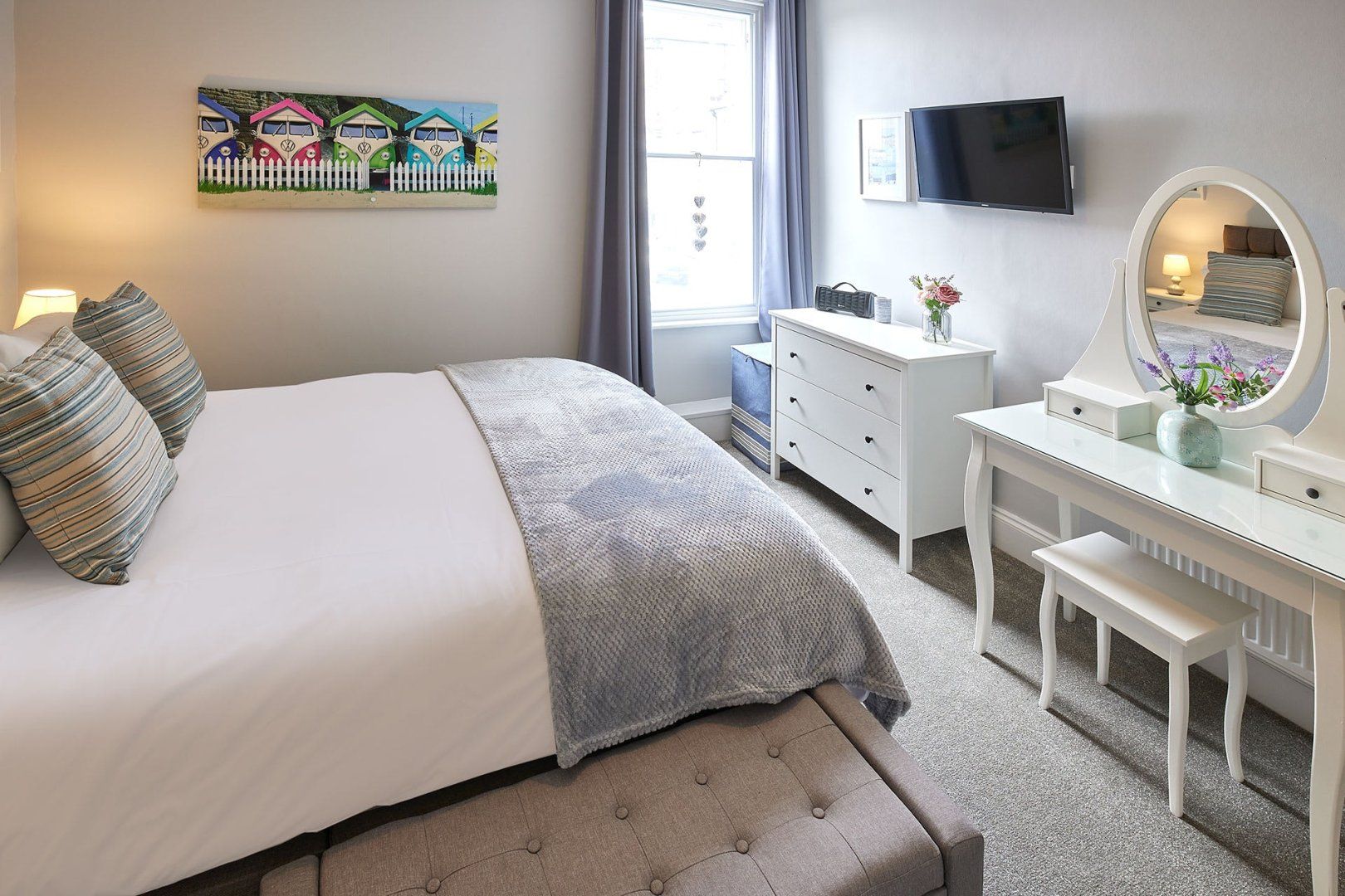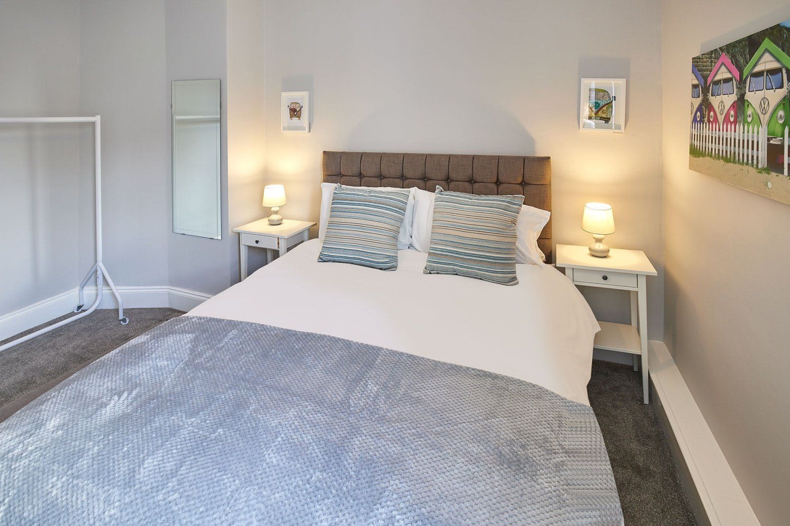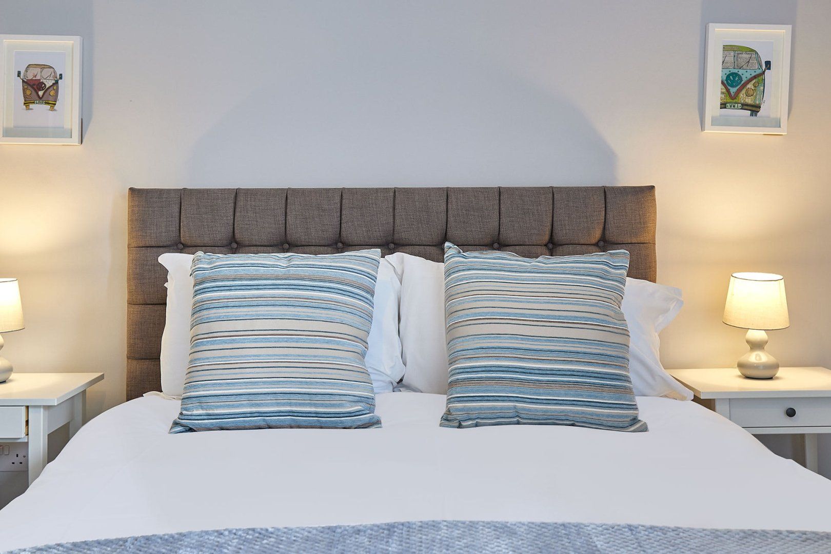 Dressed in shades of blue reminiscent of the nearby sea, the bright open-plan living area is where you’ll want to kick up your feet after a day of exploring, and enjoy a meal together when you’re not out sampling the local restaurants' catch of the day. The two bedrooms, meanwhile, are just as inviting with their beautifully dressed beds and holiday-inspired artwork, and the bathroom’s rainfall shower adds another touch of relaxation you’ll relish waking up to each day.