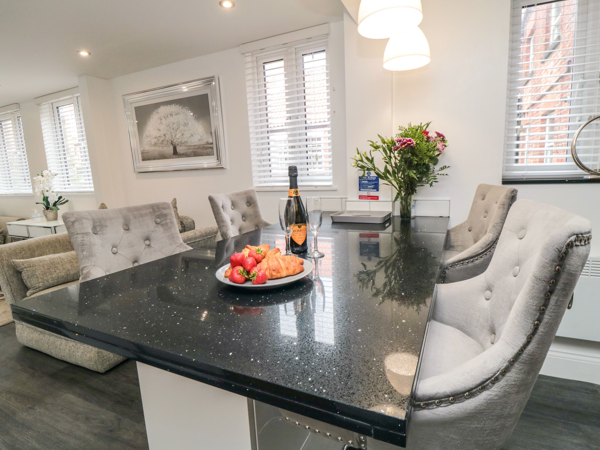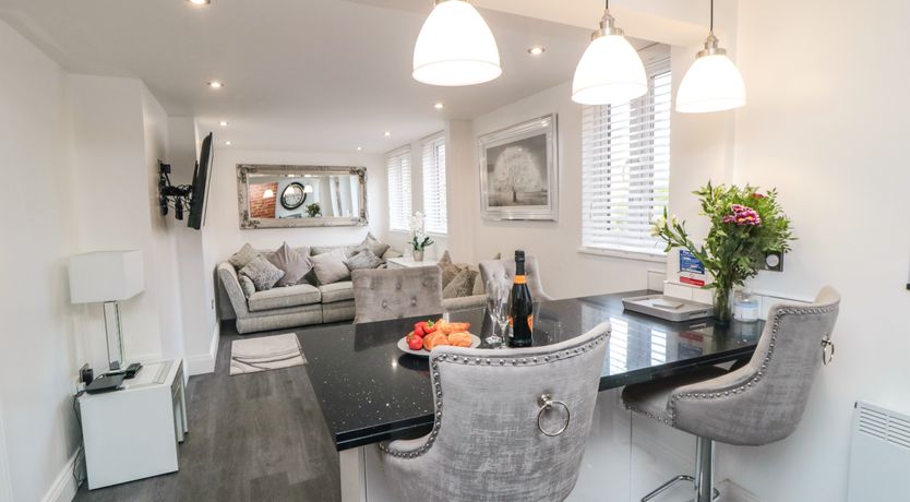 First-floor apartment. Two double bedrooms with Smart TVs. Shower room with walk-in shower, basin, heated towel rail, and WC. Open-plan living space with kitchen, dining area and sitting area with woodburning stove