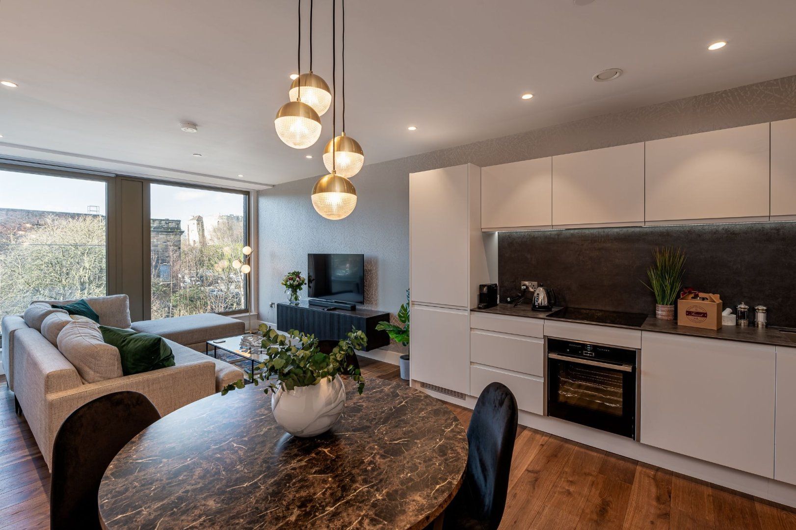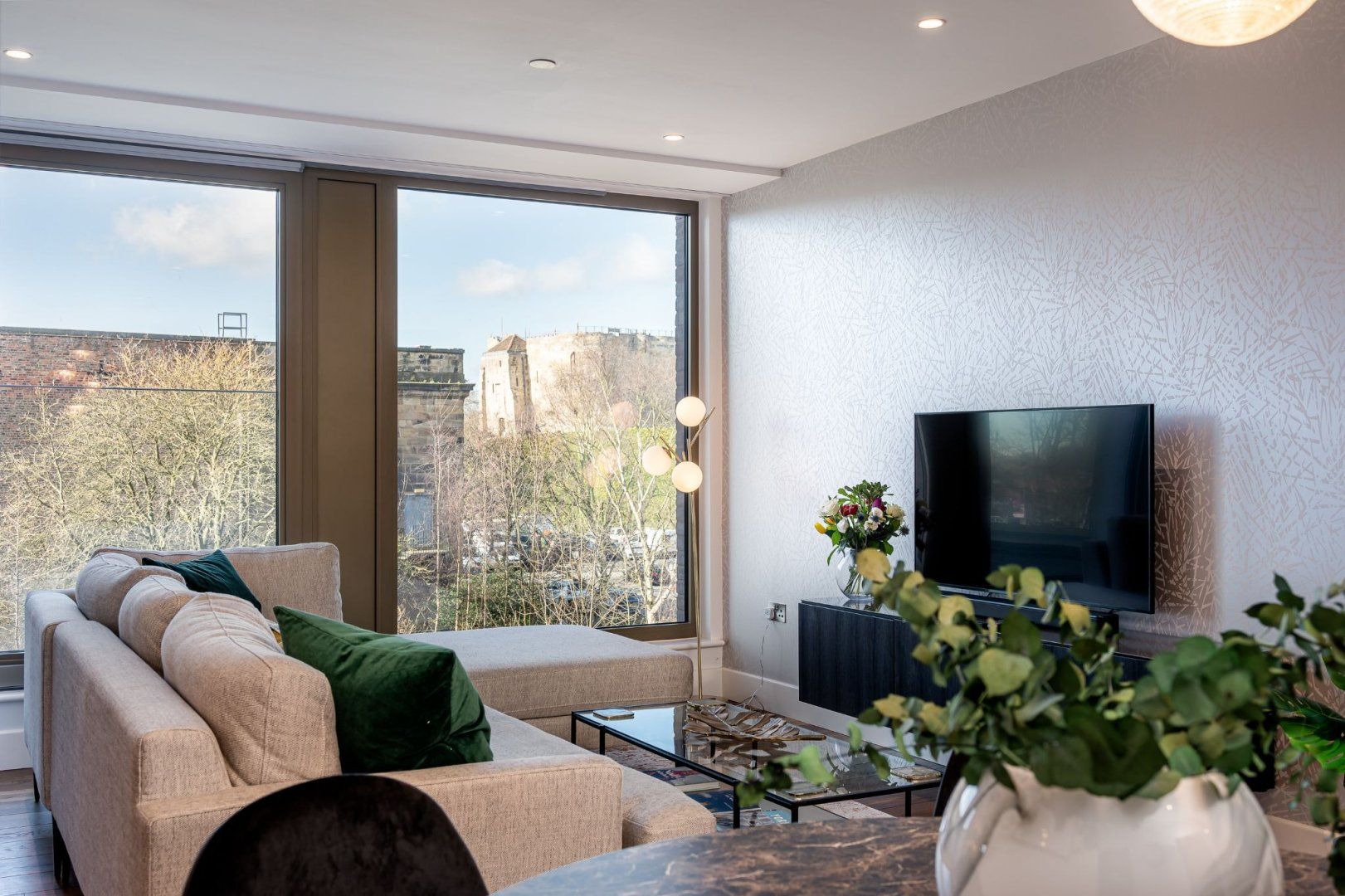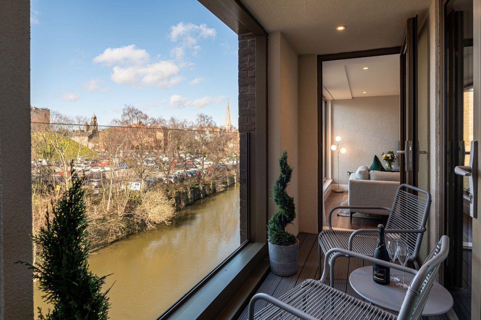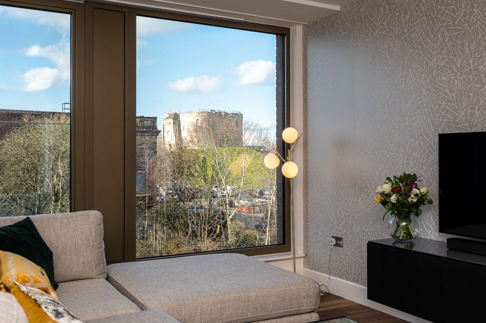 From the apartment’s balcony, you’ve got uninterrupted views over the Foss River to Clifford’s Tower – a 13th-century fortification sitting atop a hill. This is the perfect spot for a drink or two at the end of the day. River views continue inside, where floor-to-ceiling windows in the living room flood the place with natural light. Hardwood floors add a classy touch, and the underfloor heating is a delight in the winter months. The open-plan living area feels spacious and sleek, and the master bedroom is particularly plush with its chaise longue and desk should you need to work remotely.