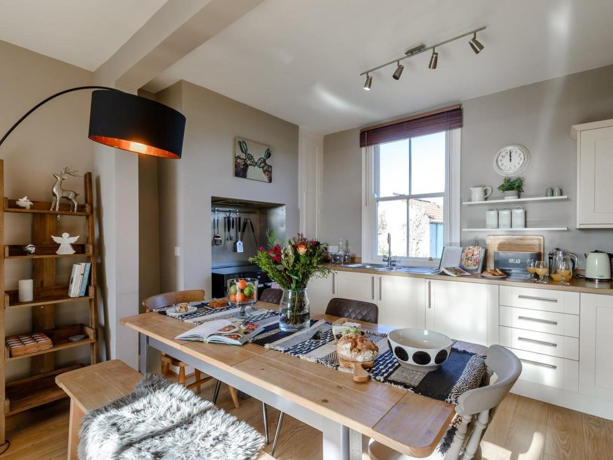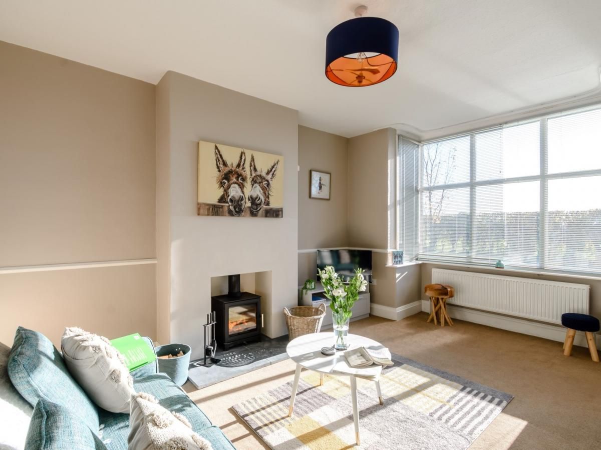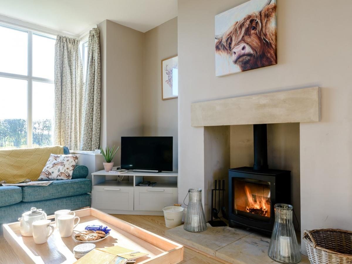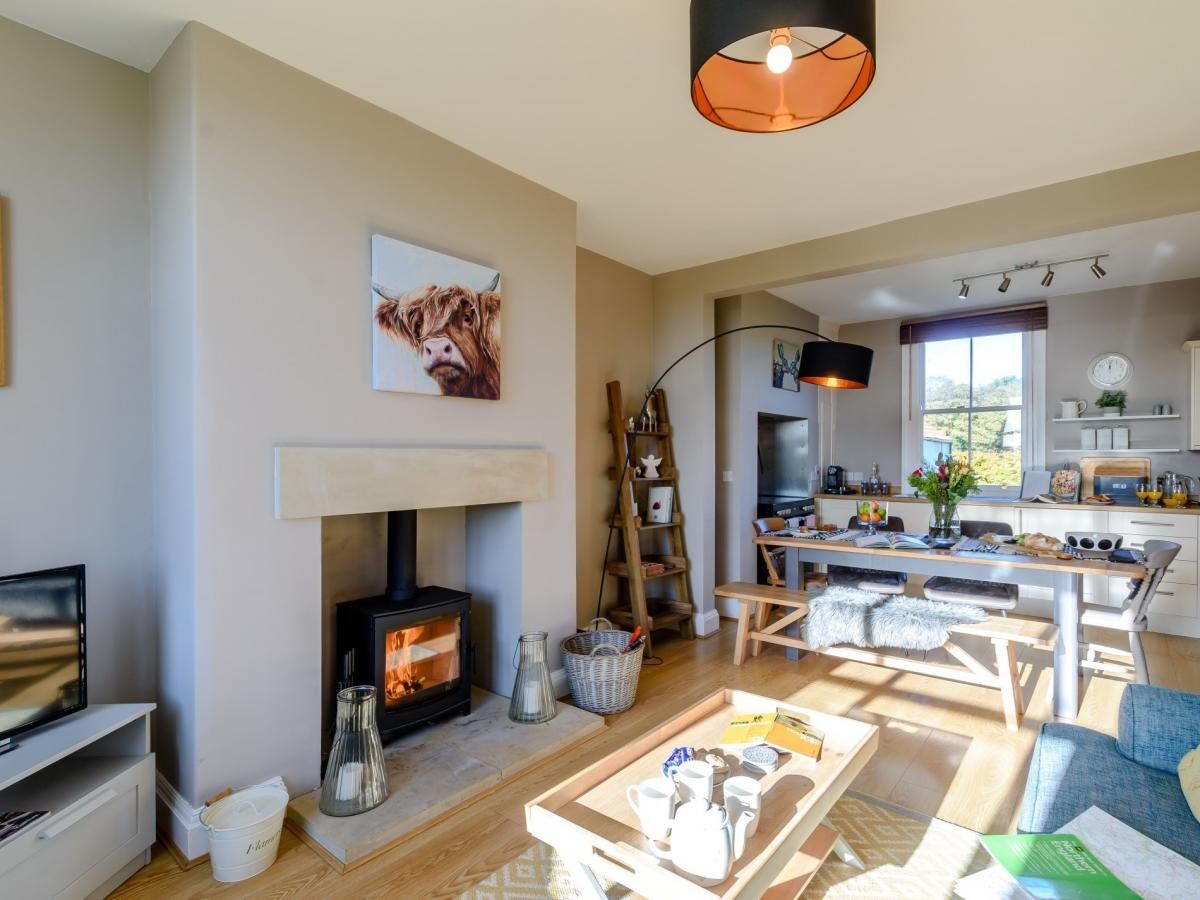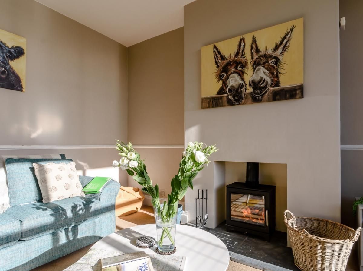 It has an open-plan living space and a separate lounge, both with cosy wood burners, and a large, enclosed garden.