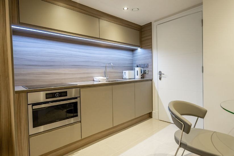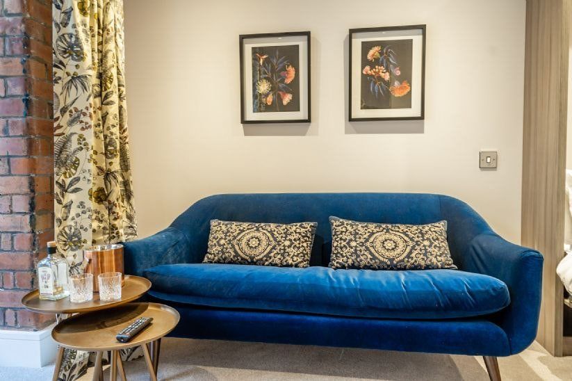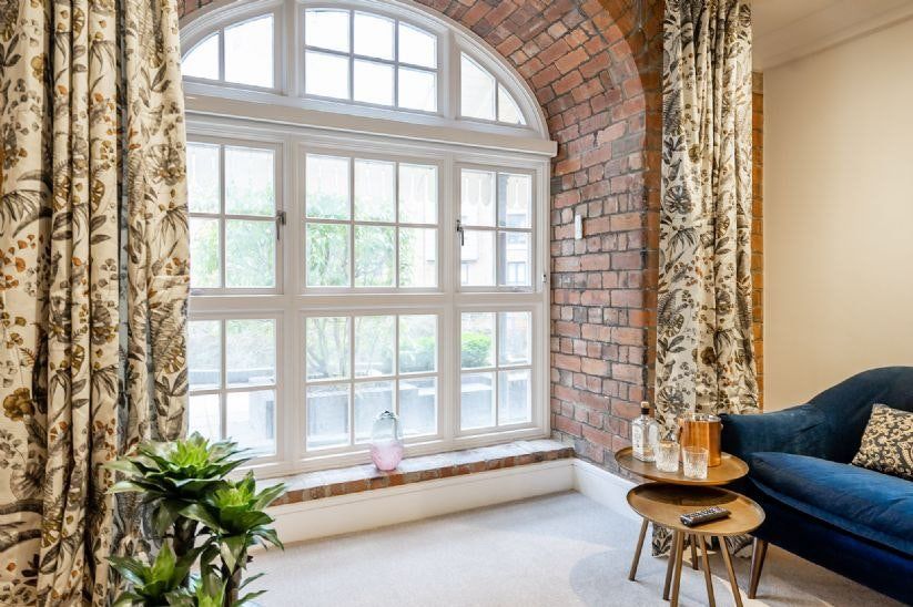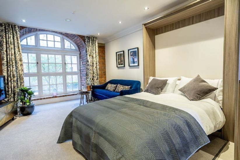 The small city of York has two sides to it. While ancient historical landmarks are everywhere you turn, its 21st-century sensibilities are also very apparent. Castles and cathedrals sit alongside high-street shops, fine-dining restaurants, and all sorts of bars – would you prefer a fancy cocktail or a traditional pint of pale ale? And where history and modernity collide, this home sits somewhere in the middle. An eight-minute stroll from the medieval walking streets of The Shambles, this studio apartment is set in a converted warehouse-style block on the edge of the River Foss. Red bricks and sash windows make this building stand out, and the delights keep on coming as you step inside. With space-saving innovations like the wall-mounted bed, this studio can be quickly changed to suit your needs, whether you’re entertaining or relaxing. We love how the huge arched window, set in original red brickwork, illuminates the space from the royal-blue velvet sofa, all the way back to the classy kitchen. With a colour palette of understated greys and creams, it’s an elegant space with a modern glass dining table where you can enjoy a Sunday roast (or a gin and tonic).