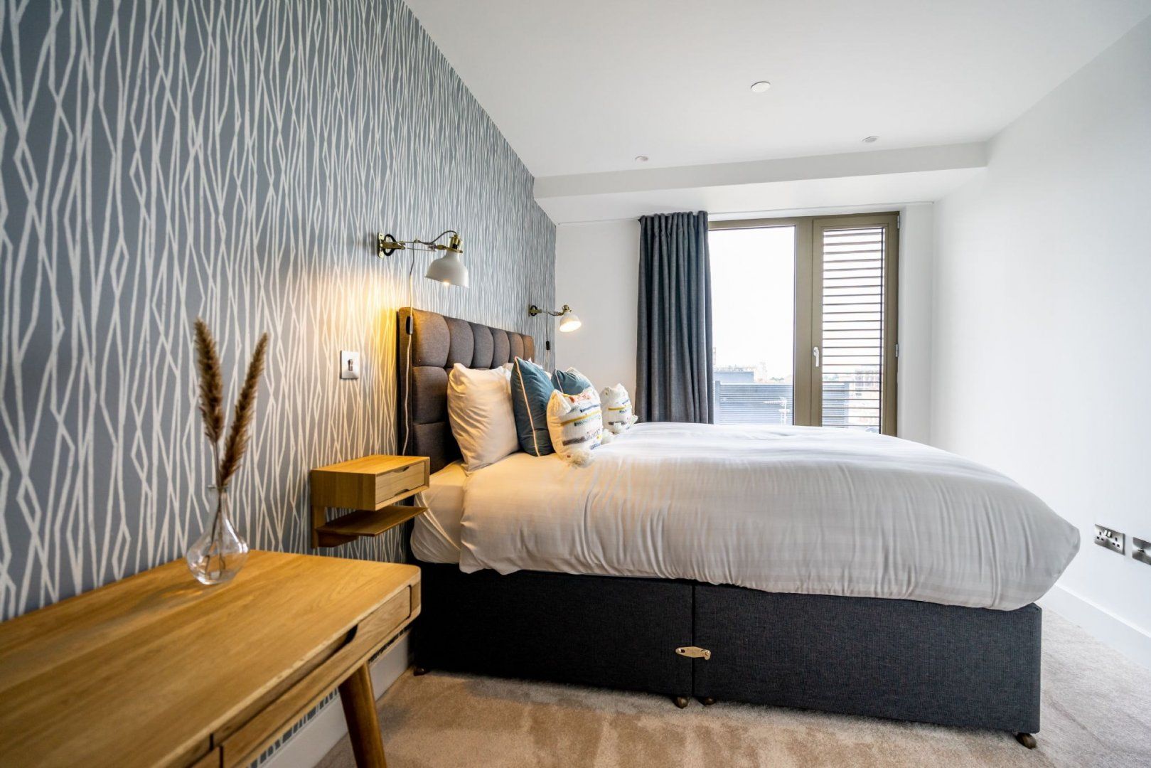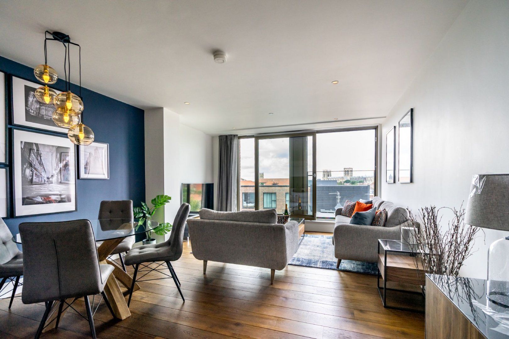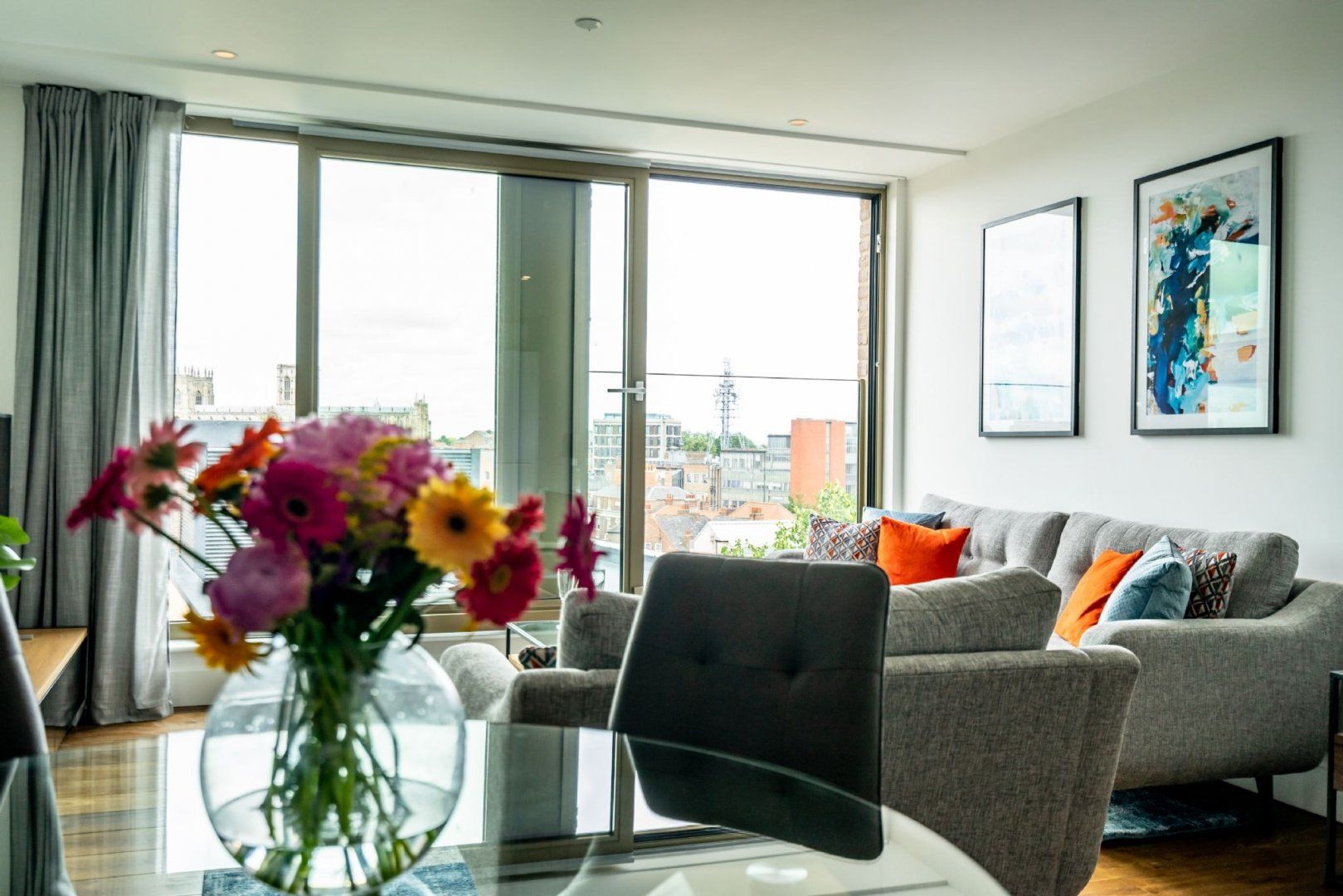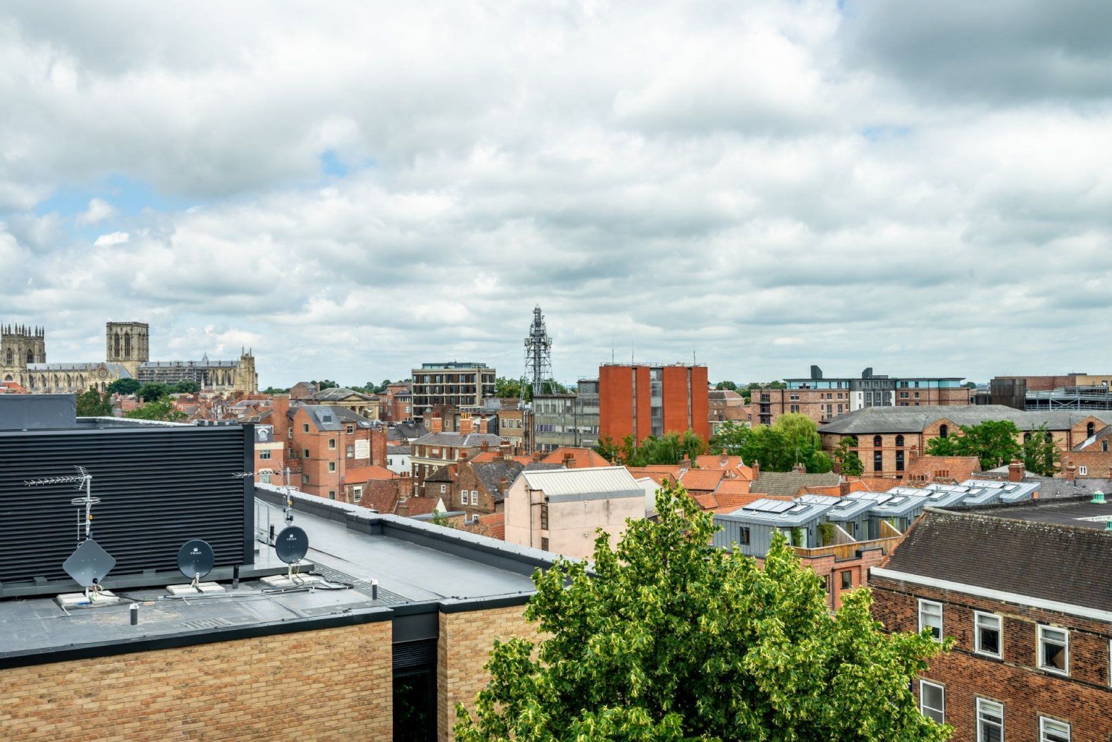 Just a few hundred metres from the centre of York – with stunning views of the magnificent York Minster cathedral from your sixth-floor vantage point – this sleek and contemporary apartment is ideal for a couple of friends or a family to discover the history of this vibrant festival city. Sunlight streams into the open-plan living room and kitchen through floor-to-ceiling sliding windows that open up so you can enjoy a fresh breeze without leaving the flat. The kitchen is equipped with high-end appliances with an island/breakfast bar that separates the rest of the room. The beautiful hardwood floors lead you through to the two generously sized bedrooms. The master room boasts its own en-suite complete with underfloor heating and a walk-in shower. Head downstairs and out onto the characterful cobbles, just a few minutes from the medieval city walls and approximately a ten-minute walk from the renowned Bettys Café Tea Rooms.