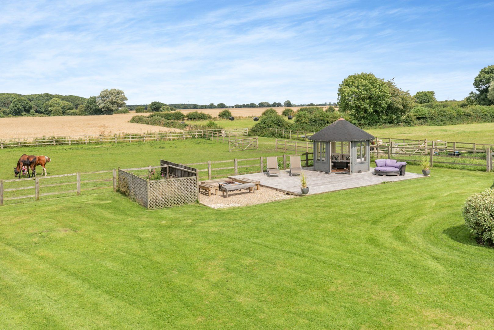Accomodation Details Four bedrooms: 1 x super king with en-suite double shower, WC and basin, 2 x king-size double ( on request one king size can zip link to twins), 1 x double. Bathroom with bath, shower over, hand-held shower, basin and WC, ground floor cloakroom. Open-plan living room with kitchen, dining area and sitting area. Utility. Sitting room with woodburning stove. Games room. Ample Outdoor seating under the Pagoda. Cot and highchair available upon request.