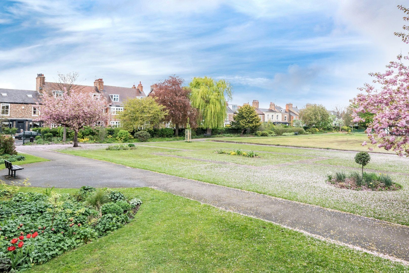 *There is a large public park with rose gardens, a bowling green, tennis courts, and a basketball court directly across the road from the apartment
