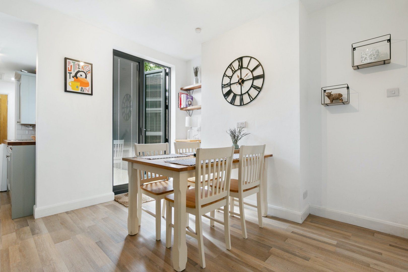Moving through the house brings guests into the kitchen/dining room. The kitchen has been stocked to provide everything guests need for a comfortable stay and the dining room can seat 4 people. Beyond, guests will find the sink, along with washing machine and fridge freezer.