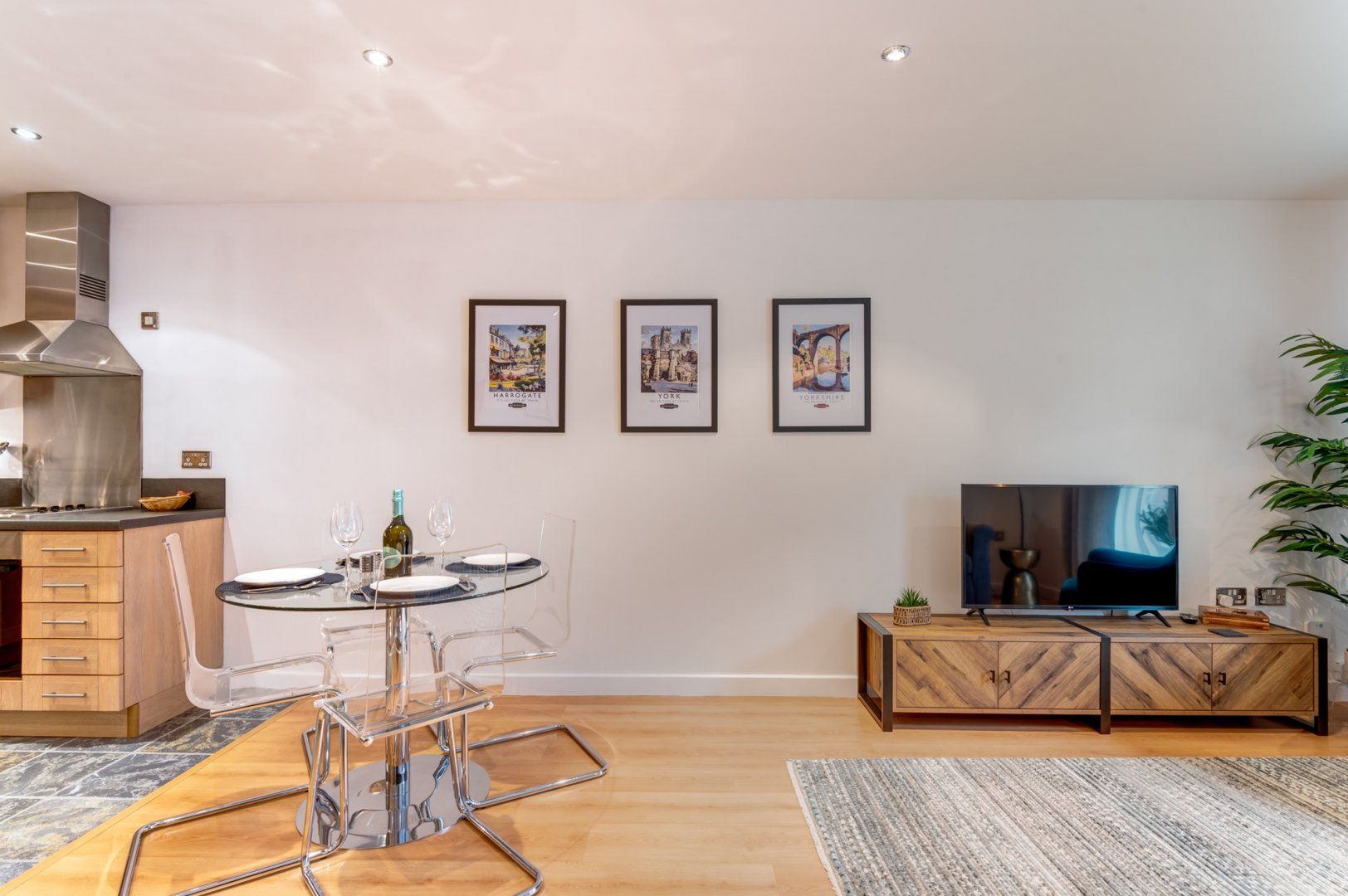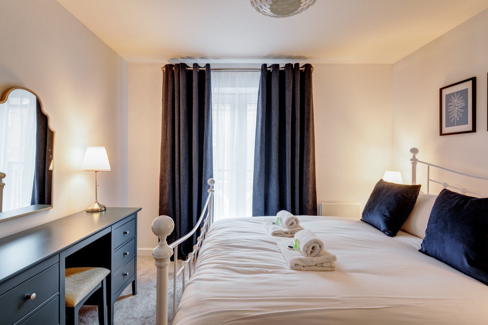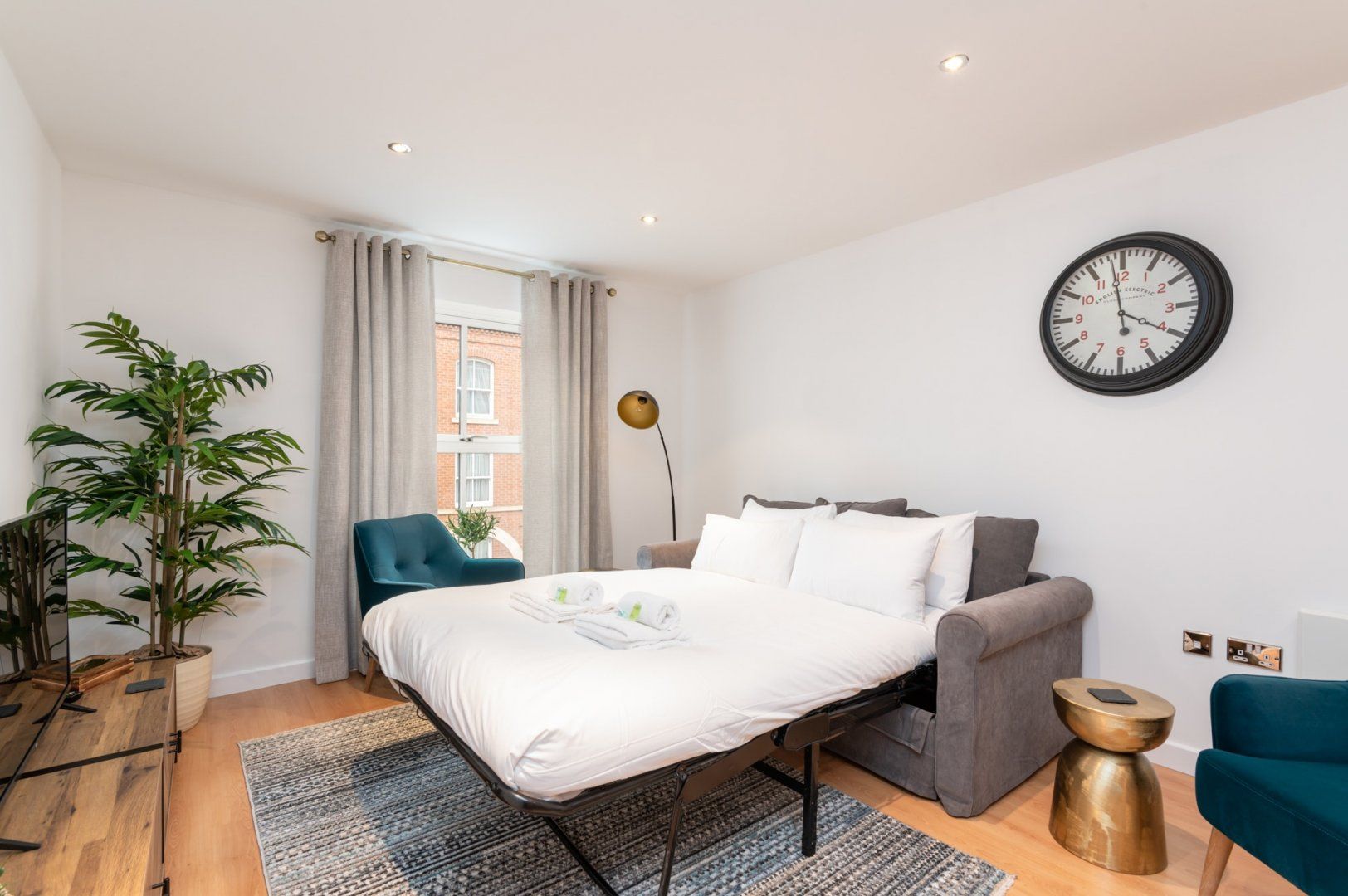 This apartment lies right in the mix of York’s City Centre West, within a few minutes’ walk of the famous River Ouse and historic sites like York Minster and Shambles Market. Nearby, you’ll also find a host of fine local shops, restaurants, and bars along Bishopthorpe Road and Micklegate. The flat’s simple yet elegant furnishings provide guests with a bright and comfortable space to relax and unwind after days touring the city and evenings enjoying the local nightlife. The master bedroom is especially cosy, and features a Juliette balcony overlooking Skeldergate Road, whose name is said to derive from the Viking shield-makers that once inhabited the area.
