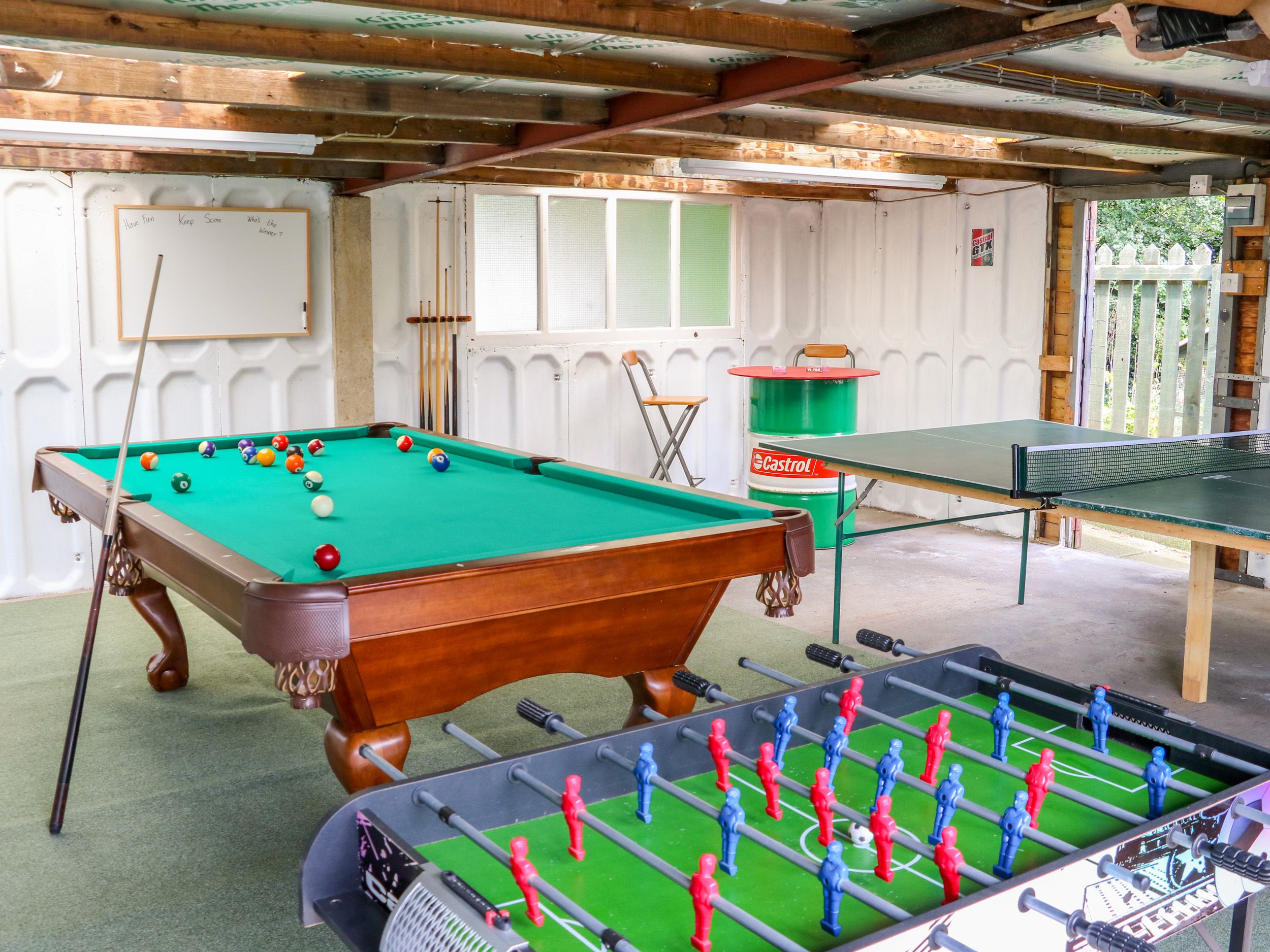 Accomodation Details Three bedrooms: 1 x king-size, 1 x twin, 1 x single. Bathroom with shower over bath, basin and WC. Kitchen. Sitting/dining room with electric fire. Games room with pool table, table tennis, football tabl