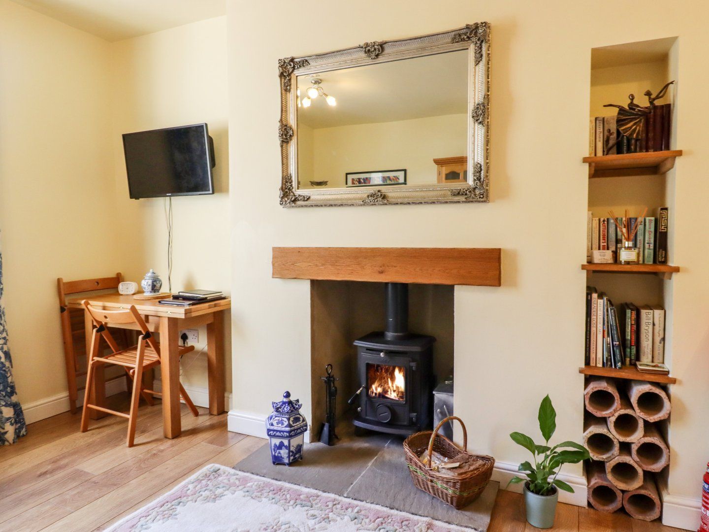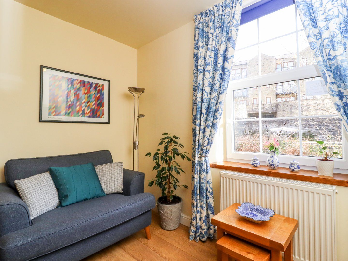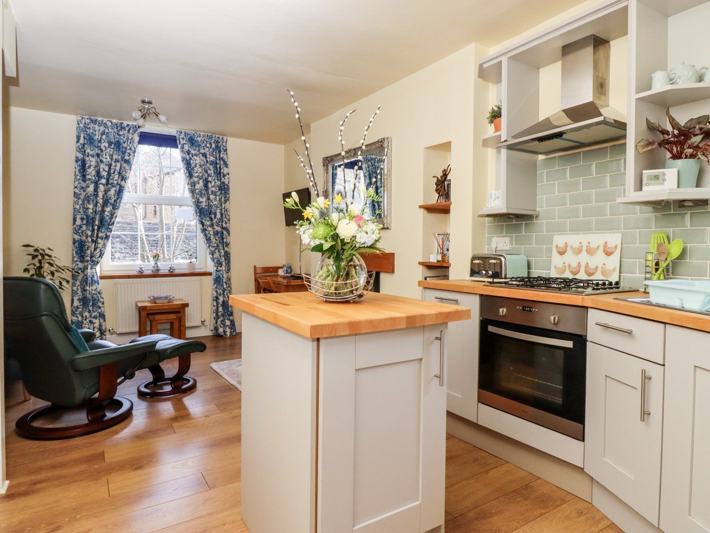Upstairs wasn't as good. Just as clean, yes, lovely fluffly towels, nice bedding - we used both bedrooms as two adults, just to have more space. And space is what is lacking up there. The double bedroom contains a small double bed, 4ft I think, the bedroom door can only open to 45 degrees, roughly, against the bed that is in the way. the furniture is lovely, so is the view over the canal, furniture, decor, all good, mattress so-so, good for one person. The other single room felt more spacious, also fine, we both slept well. The bathroom, however, is frustrating, beautiful with light brown travertine tiles, floor to ceiling, but to stick a full length bathtub in there that leaves only a squashed horse shoe space for the toilet, well, it just beggars belief. My inside leg is 32", very challenging, my leg touching the heated towel radiator, which thankfully wasn't switched on, but the small space for a large and/or tall person is kind irritating to say the least. The cistern is high and very noisy, try not to flush the toilet at night when people are sleeping. The washbasin, close to the bathtub is the tiniest of cloakroom basins which doesn't hold the water properly, arrgh! Why not get rid of the bath, have a wetroom/walk in shower set up in there, and give people some space? Also, there was nowhere to dry swimming or hiking gear, an extendable washing line wouldn't go amiss, but with no washing machine nor anywhere to hang hand washing I had to resort to buy some string at Tesco's to make a temporary washing line. This place would be perfect for one or two very slim/petite people, who don't have wet things to dry and who fit on that toilet comfortably, I think three people would struggle if staying for longer than a couple or so nights. The shower itself is great, powerful, height adjustable, and if, like us, you like to finish your showers with a cold burst, Wim Hof style, this water is cold, boy, good training, we shall miss it. There is a shaver socket on the side of the mirror that can be lit up (switch at the bottom) and the sky light is a nice touch for this windowless room. The cottage is very quiet at night, great for a good night's sleep - if you ignore the extreme toilet flush racket and the blinding security light in the hall, - the fridge, TV, overall comfort is great, with the exceptions stated above. A very central place, easy to walk everywhere, the car park just a couple of minutes walk away very good value, all very easy. You can load and unload your car in front of the door, access to the houses there is tight but possible. Phone reception upstairs, and good wifi throughout. I would have liked to give it 5 stars, but the bathroom bugged me increasingly over the week, - a 4.5 star rating would be the most accurate. Friendly owner communications, too.