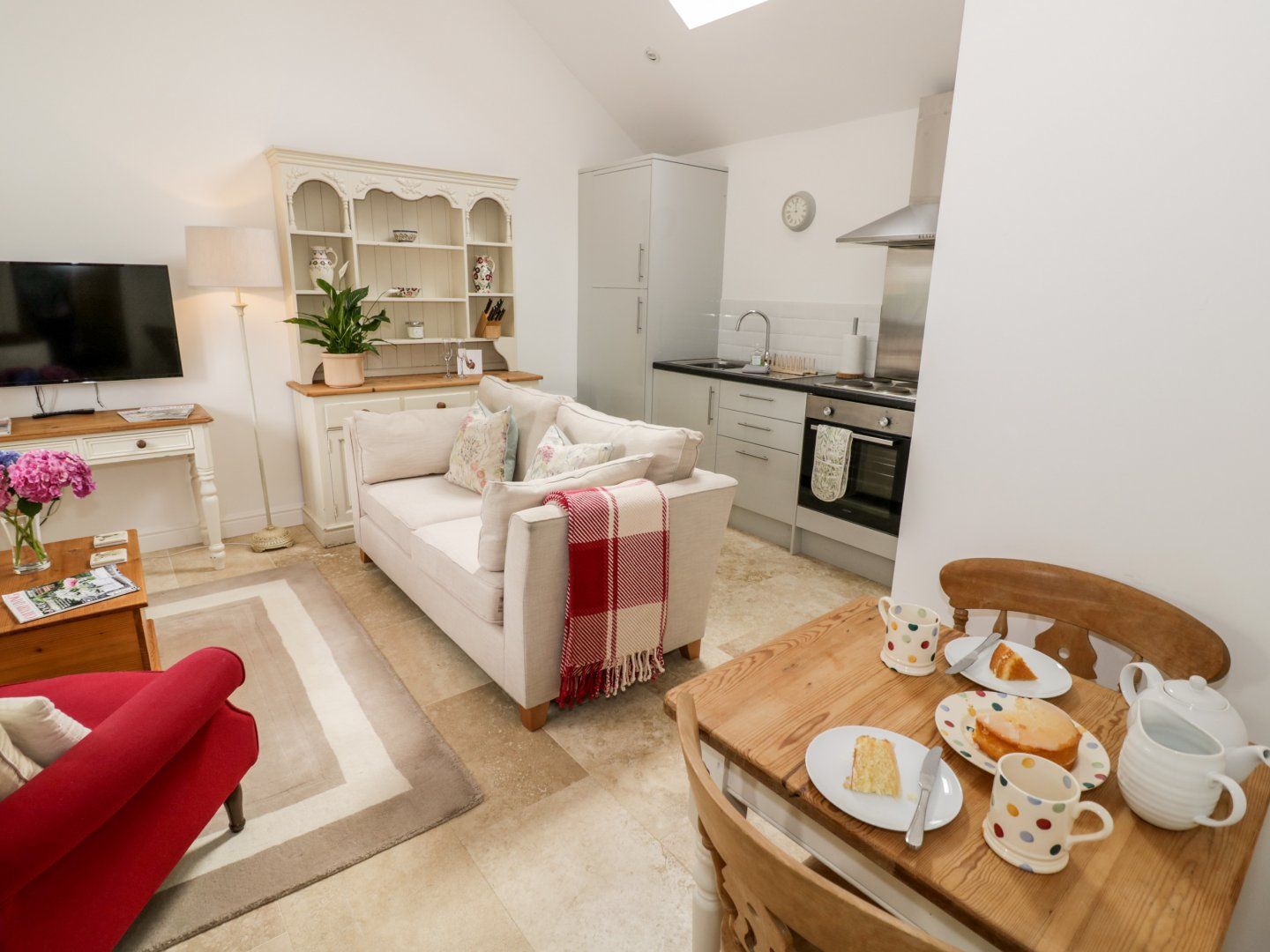 Accomodation Details All-one-level. One king-size bedroom with en-suite bathroom with bath, shower over, basin and WC. Open-plan living space with kitchen, dining area and sitting area