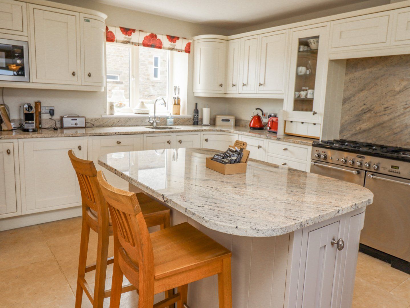 Kitchen with polished stone floor, gas Range oven and hob, fridge, freezer, dishwasher, washer/dryer, microwave.