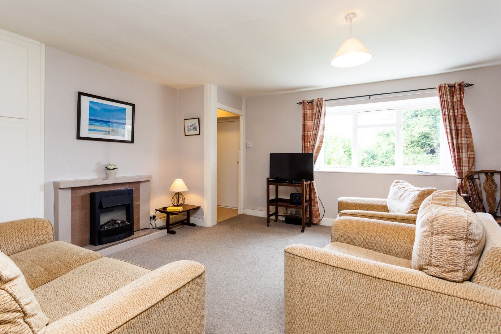 Two bedrooms: 1 x bunk, 1 x family room with double and single. Steep Stairs. Ground-floor bathroom with bath, shower over, basin and WC. Kitchen. Sitting/dining room with electric fire stove