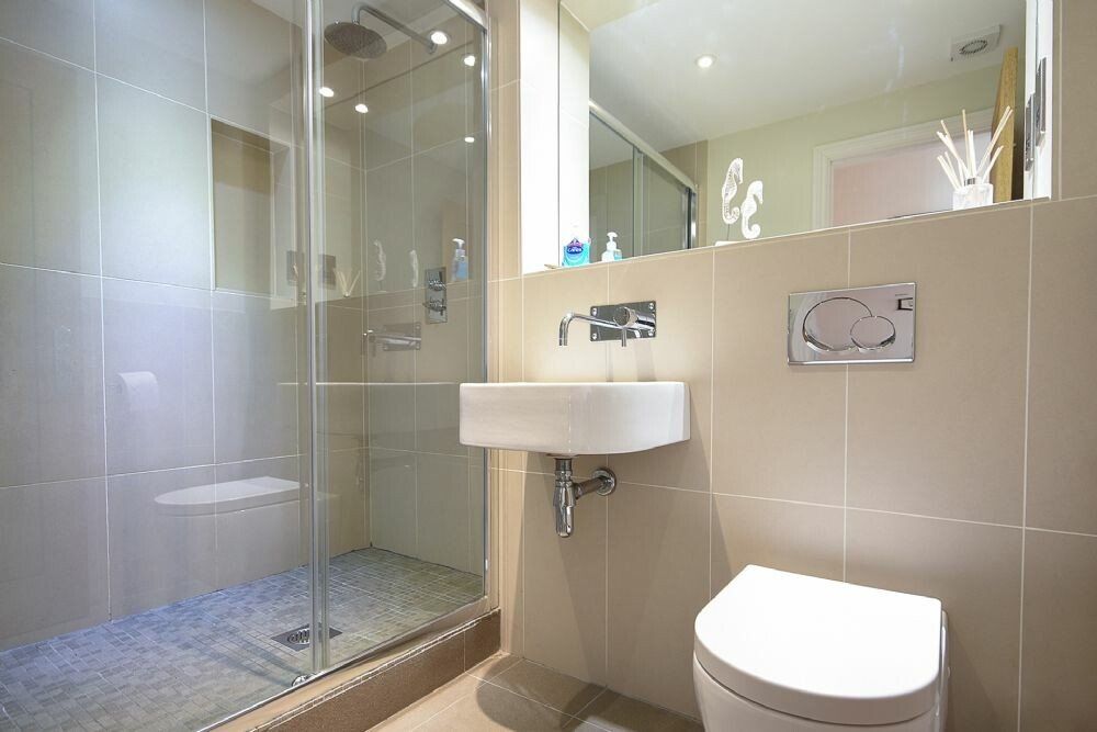 Bedroom 1 with king size bed, TV, en suite shower, WC and basin.