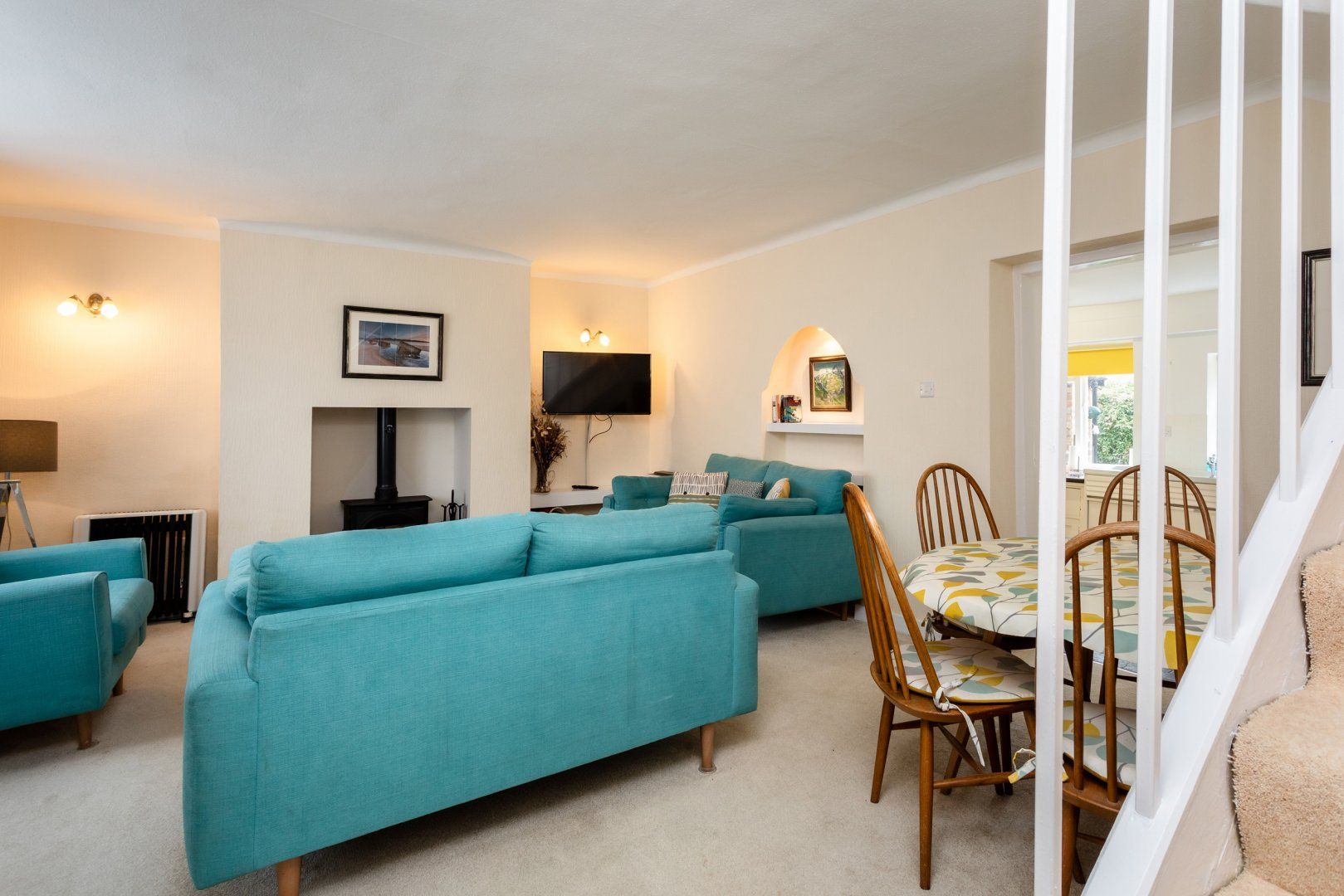 Electric heating with woodburning stove. Electric oven, grill and hob, microwave, fridge/freezer. Smart TV, WiFi. power inc. in rent. Bed linen and towels inc. in rent. Unallocated roadside parking nearby. Patio area, patio furniture. One well-behaved dog welcome. Sorry, no smoking. Shop 0.1 miles, pub 0.1 miles, beach 0.6 miles