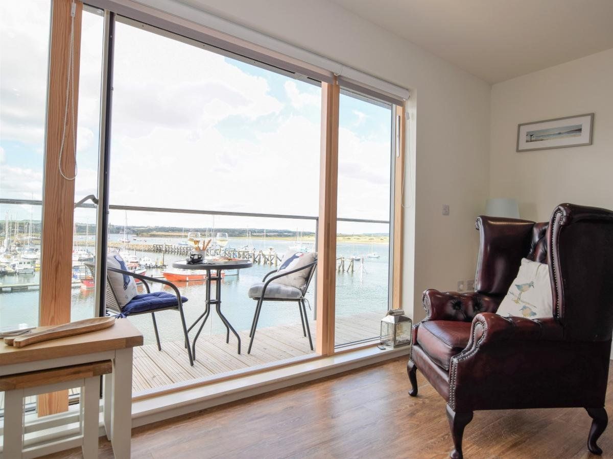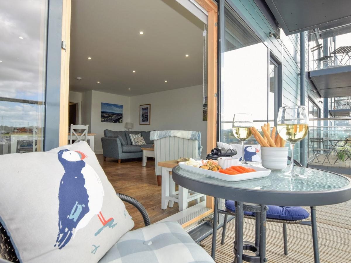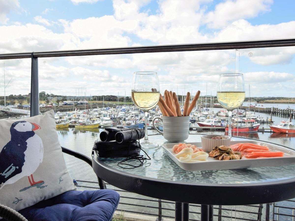 Relax in style and comfort in this beautiful holiday property with its dual-aspect, wrap-around balcony which affords you expansive views of the ever-changing light throughout the day from sunrise to sunset. Gaze across the yachts and boats moored in Amble’s popular marina towards medieval Warkworth Castle, on the Coquet Estuary.