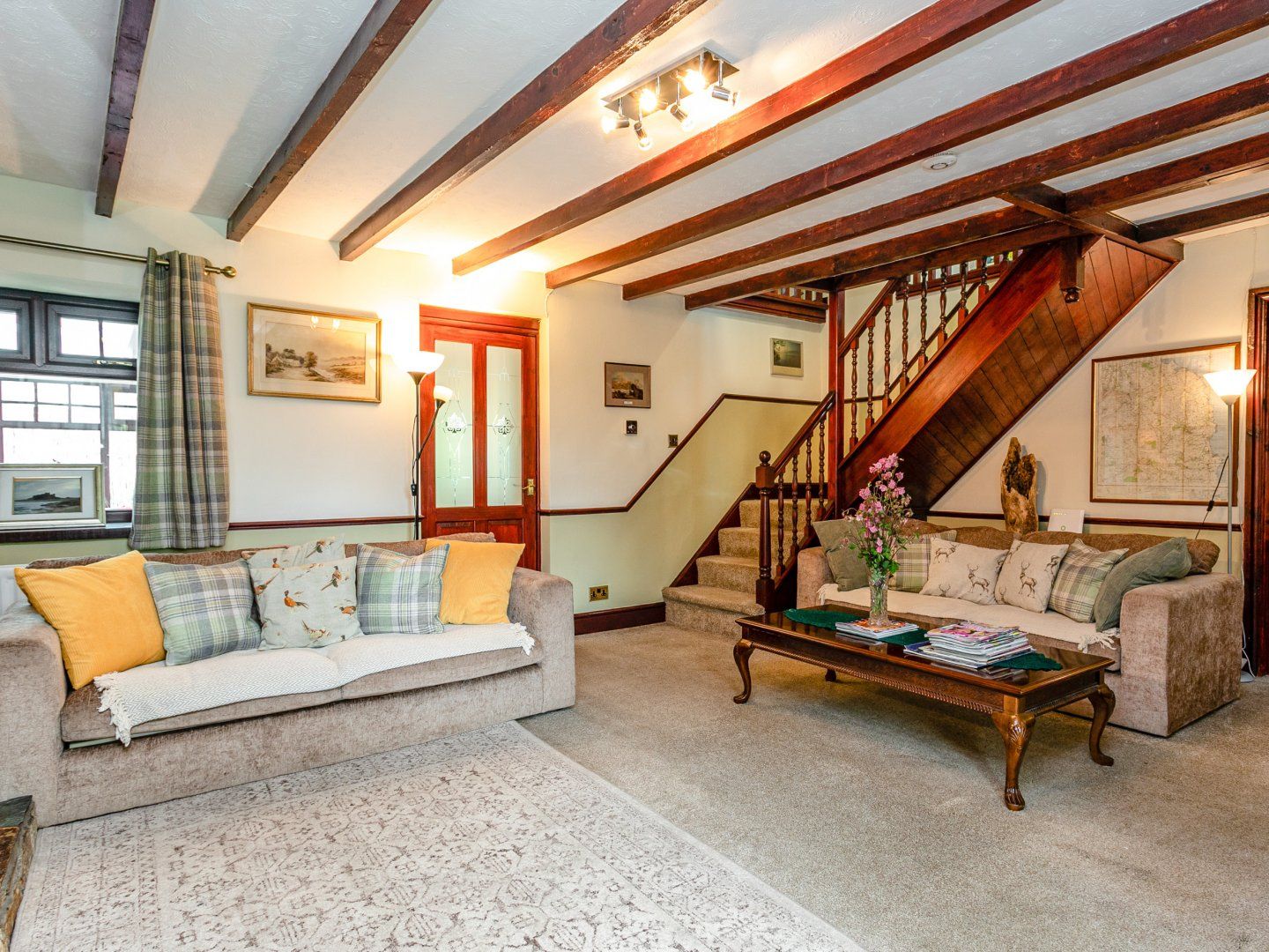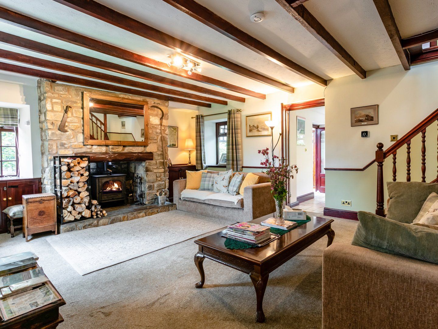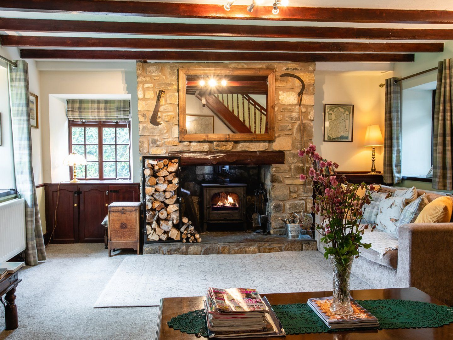 Living room with multi fuel stove set in an inglenook fireplace, comfortable seating and wall mounted TV with Freeview, DVD & CD player with bluetooth.