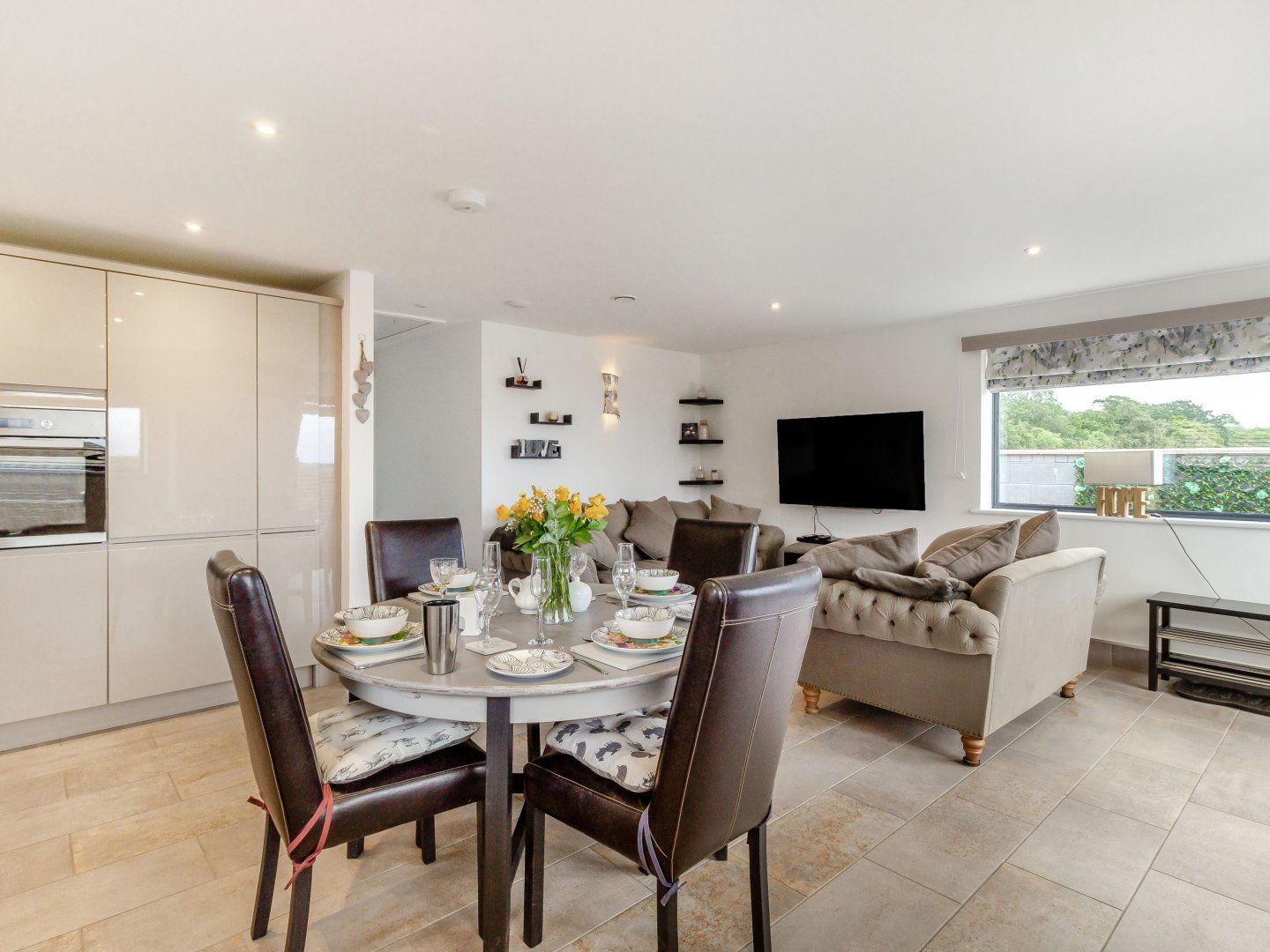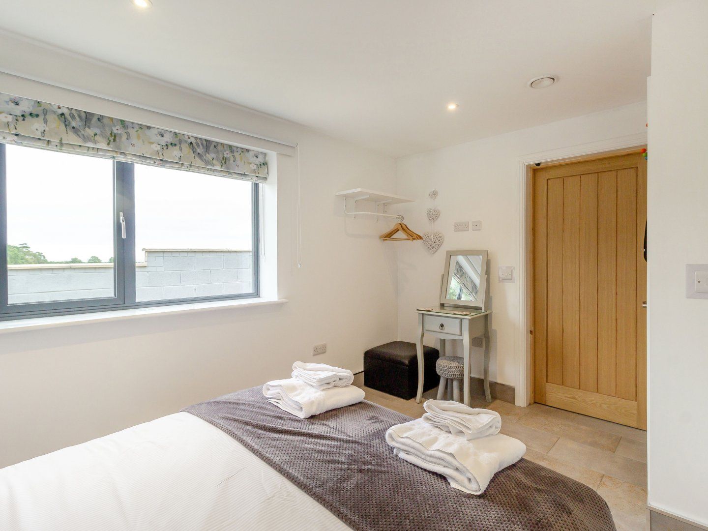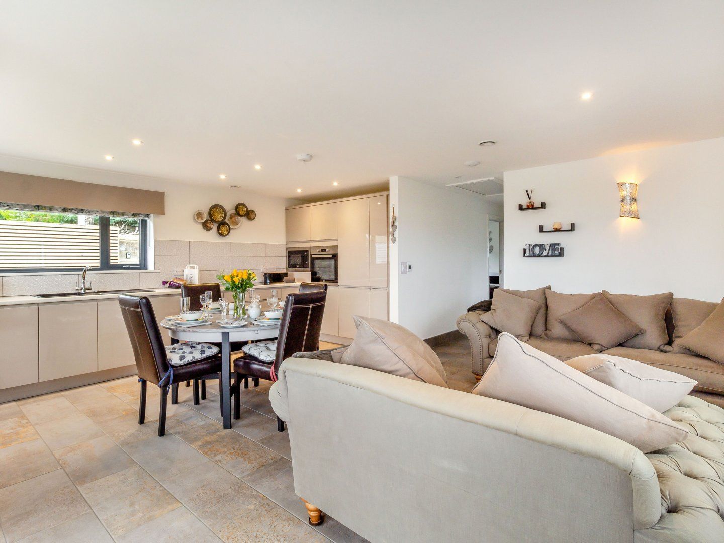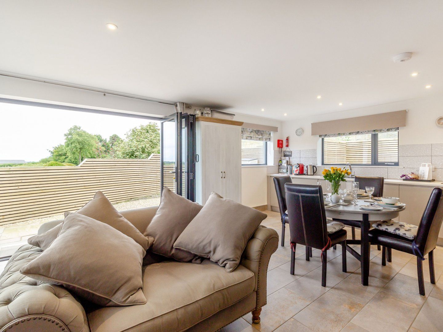 Accomodation Details All-ground-floor. Mechanical ventilation and heat recovery system - the air filtration system pumps constant fresh filtered air. 2 x king-size double beds (6’6” long), hair dryer, black-out blinds, wall hung reading lights and also sockets above bedside table for lap-top, smart phone, Kindle. En-suite with walk-in large quadrant shower, wall hung basin and WC, back-lit mirror, shaving sockets in both en-suites. Open-plan living room with kitchen, dining area and sitting area