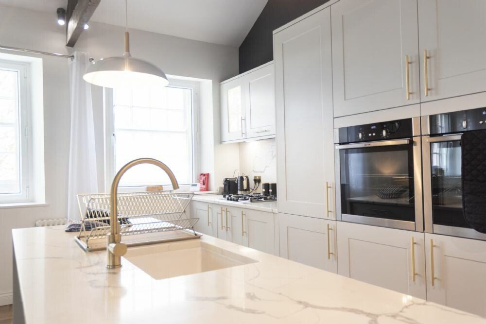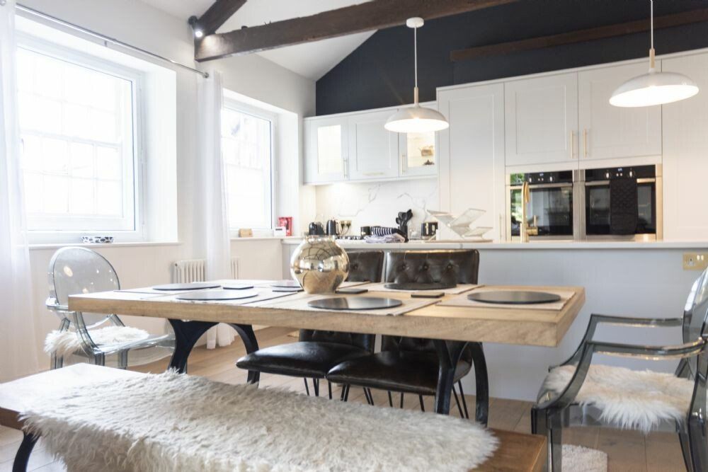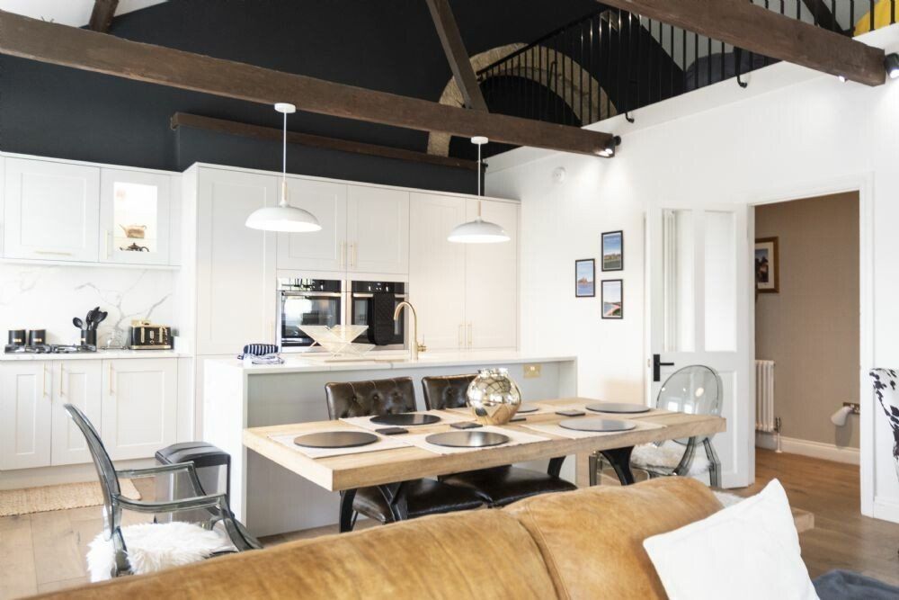 Holiday home New Addition: May 2022. Treetops offers a stunningly modern apartment with open plan space to accommodate all your needs. A beautiful kitchen with marble details and large island area allows for space to enjoy a meal as a group after a long day. The extension of the kitchen into a dining and living area is perfect for a social holiday where you can enjoy time together. The mezzanine offers a unique way of expanding the area, making use of the natural light, high ceilings and original beams. By combining modernity and traditional features, the property creates a homely feel while having luxury on hand. Located centerally in Alnwick the property is the perfect base to explore Northumberland.
