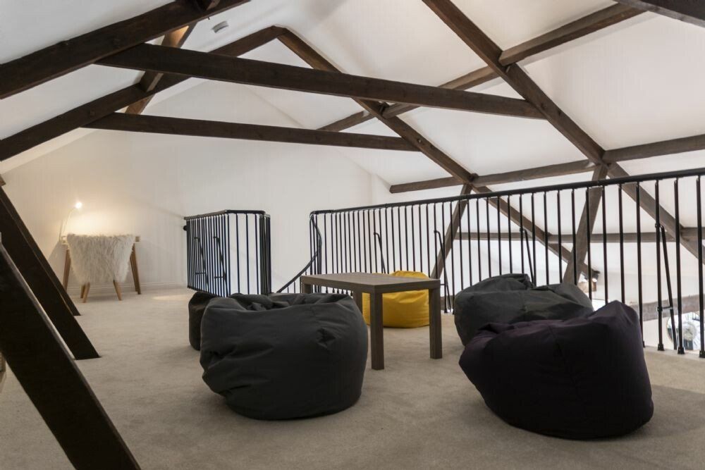 Spiral staircase leading to mezzanine balcony with bean bag sitting area.