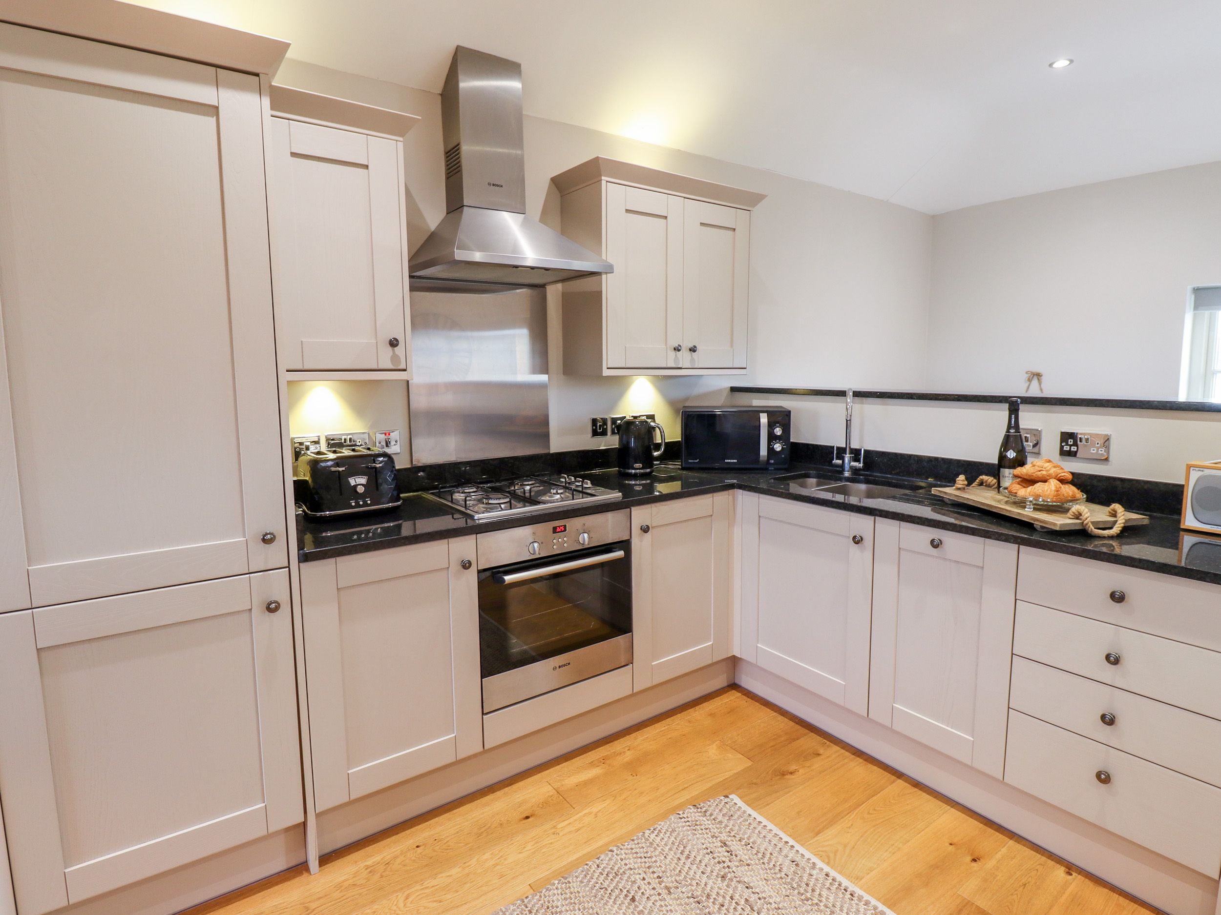 Amenities Electric wall heaters and underfloor heating in the bathroom. Electric oven, gas hob, microwave, fridge/freezer, dishwasher. Washer/Dryer in Utility room. TV, WiFi. Cot and Highchair available on request. Fuel and power inc. in rent. Bed linen and towels inc. in rent. Off-road parking available for up to 4 cars. Large gated garden area. Enclosed balcony with decking and furniture. Bike storage available in shed. Sorry, no smoking. Beach 1.5 miles Pub 0.8 miles Delicatessen 0.8 miles Butchers 0.8 miles, Supermarket/Shop 4 miles. Winter short breaks only with arrival day being Friday or Monday.