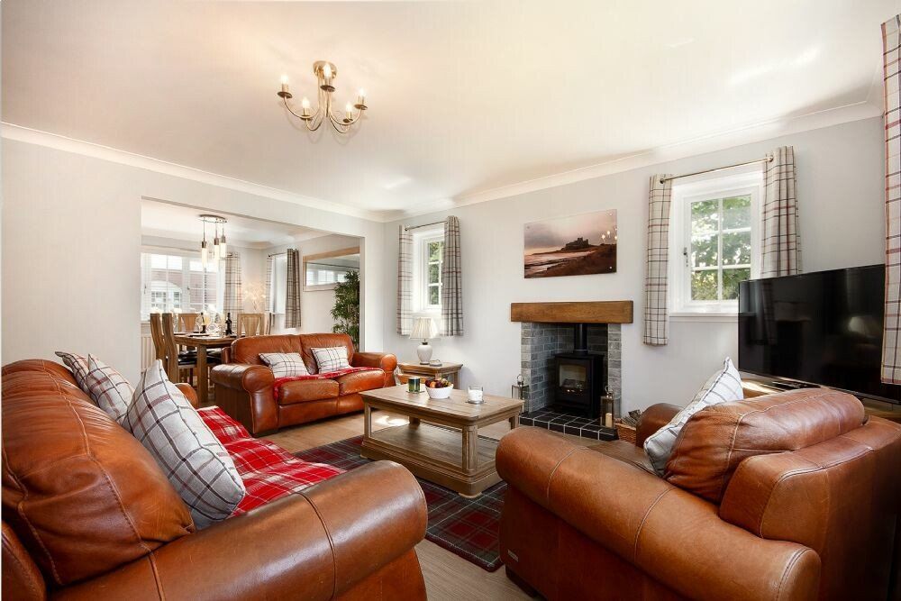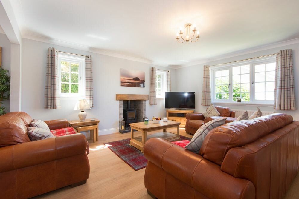 Lounge area with comfy leather sofas and armchair, coffee table, Smart TV and gas wood burner style fire.