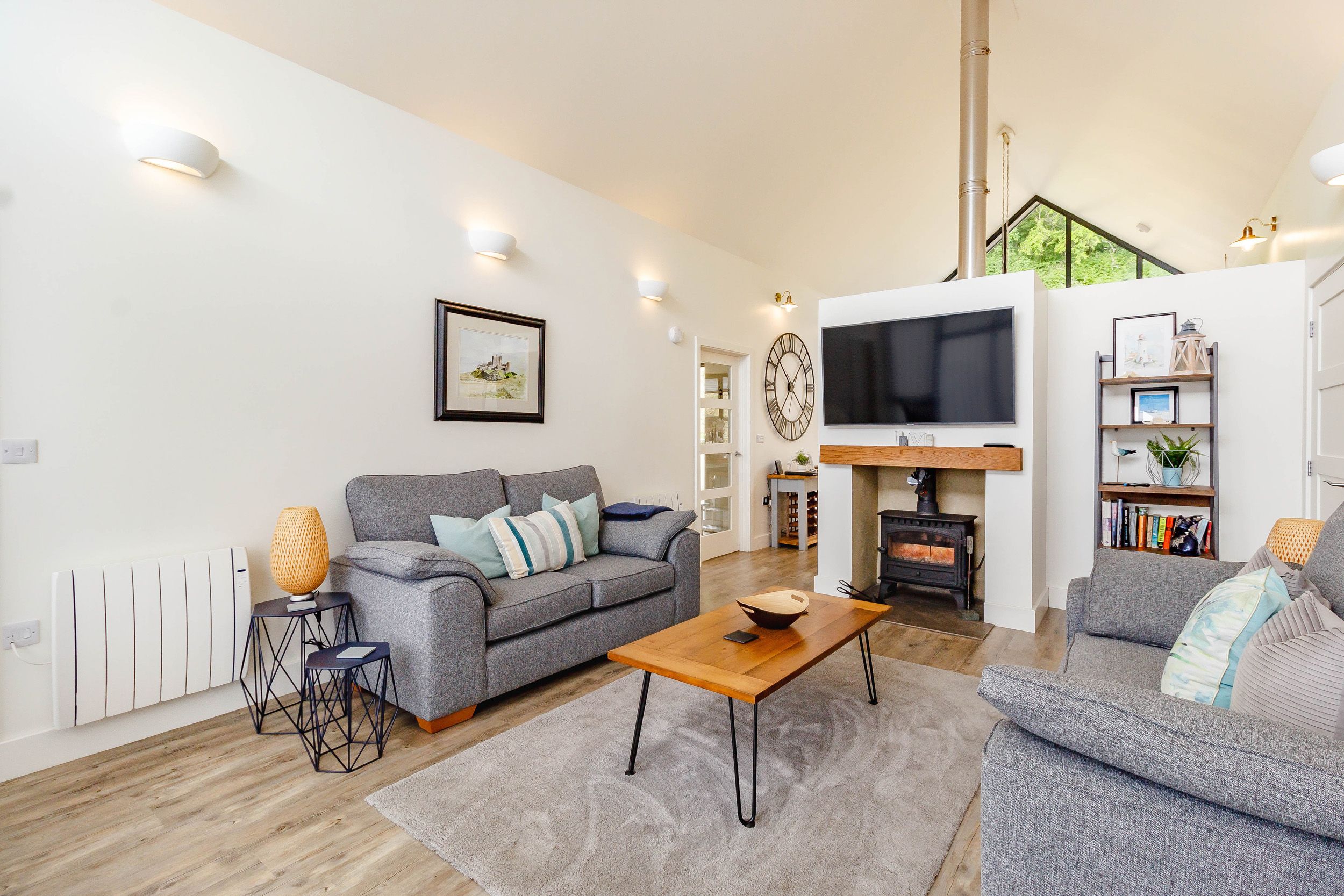Amenities Electric central heating. Electric oven and hob, kettle, Lavazza Jolie Evo coffee machine, toaster, microwave, fridge/freezer, washer/dryer, dishwasher. Bed linen and towels inc. in rent. Highchair and travel cot available on request. Welcome pack for the woodburning stove which consists of sticks/firelighters/matches and a log. On-site car park for two cars. Lawned area with decked terrace and rattan furniture. Sorry, no pets and no smoking. Shop and pub 0.4 miles, beach 2.8 miles. Note: guests need to bring their own kindling/fire lighters and logs for the woodburning stove.