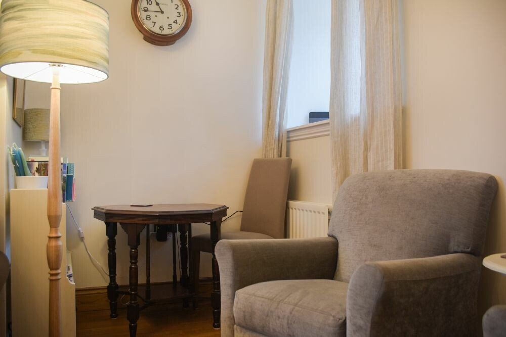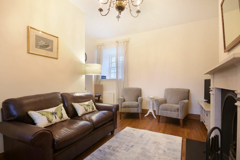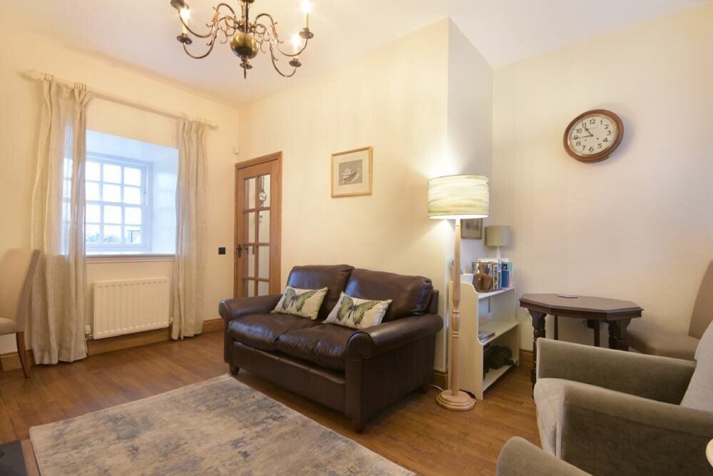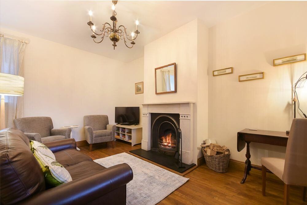 Living room with working open fire, comfy two seater leather sofa, two armchairs, TV and DVD player.