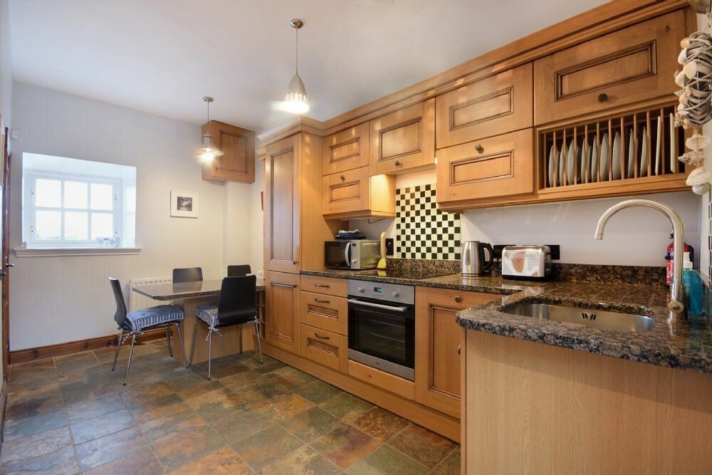 Amenities Oil central heating. Electric oven and grill, ceramic hob, microwave, fridge/freezer, washer/dryer, dishwasher. TV, DVD player, WiFi. Fuel and power inc. in rent. Bed linen and towels inc. in rent. Off-road parking for 2 cars. Gardens, patio area, patio furniture, not fully enclosed . Three well-behaved dogs welcome. Sorry, no smoking. Shop 1.7 miles, pub 0.8 miles, beach 2.1 miles. Note: Ocean Leisure Club Membership (Entrance fee payable). Note: Starter fuel for the fire is provided. Note: If you wish the king-size to be made up as a twin please let us know