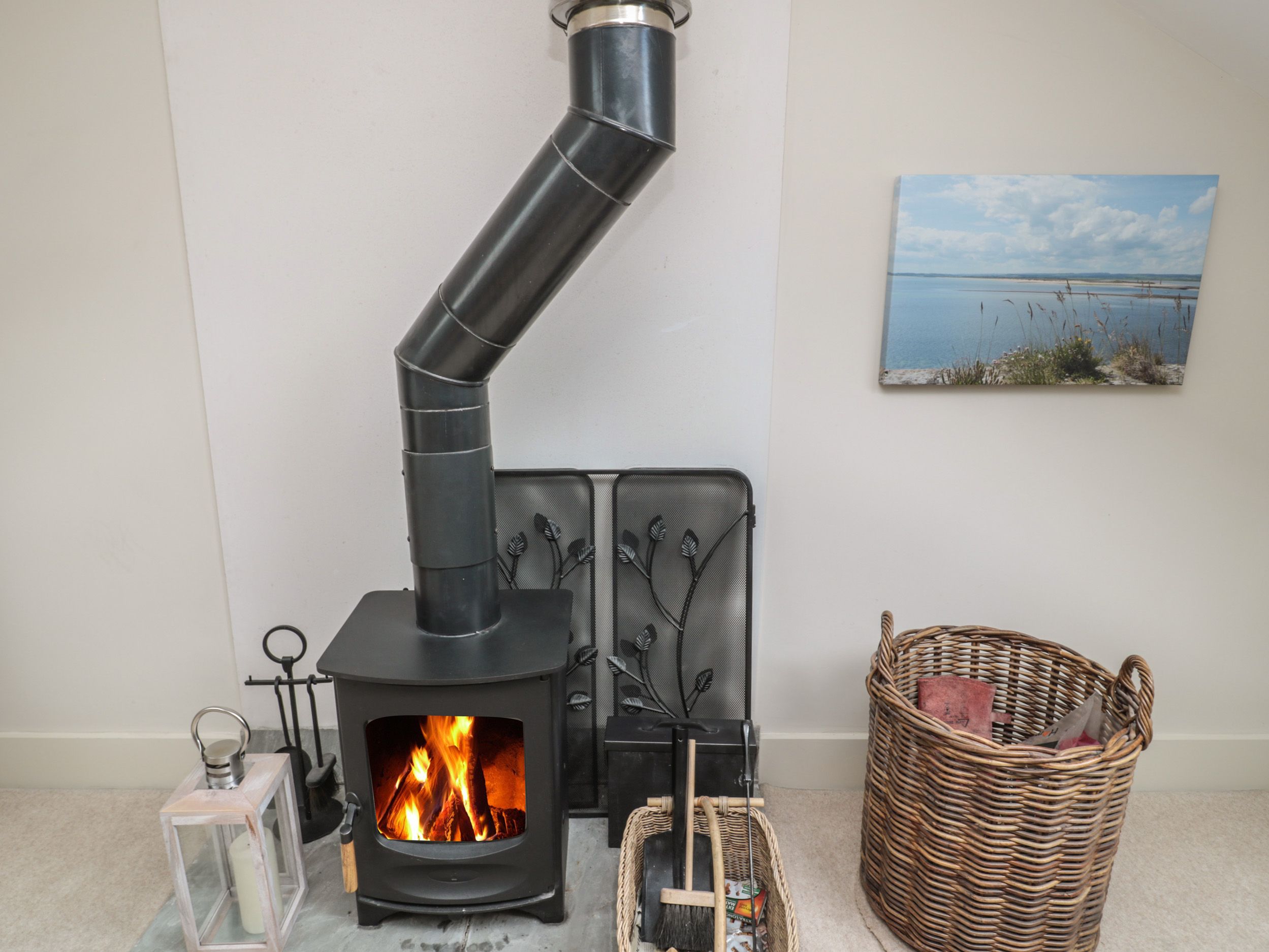 Amenities Gas underfloor heating on ground floor with gas radiator and woodburning stove on first floor. Range double electric oven with separate grill and 5-ring gas hob, microwave, fridge/freezer, washer/dryer, dishwasher, kettle, toaster. SMART TV in sitting room, WiFi and Bluetooth Speaker. Fuel, power and starter pack for woodburning stove inc. in rent. Bed linen and towels inc. in rent. Baby-friendly, highchair and stairgate available on request. Off road parking for 2 cars. Enclosed front patio with furniture. Sorry, no pets and no smoking. Shop 1.7 miles, pub 1.6 miles. Note: There are two steps from the kitchen up to the bedrooms. Note: The first floor sitting area has sloping ceilings with Velux views to coast. Please note: The property only accommodates weekly bookings during the months of July, August and September