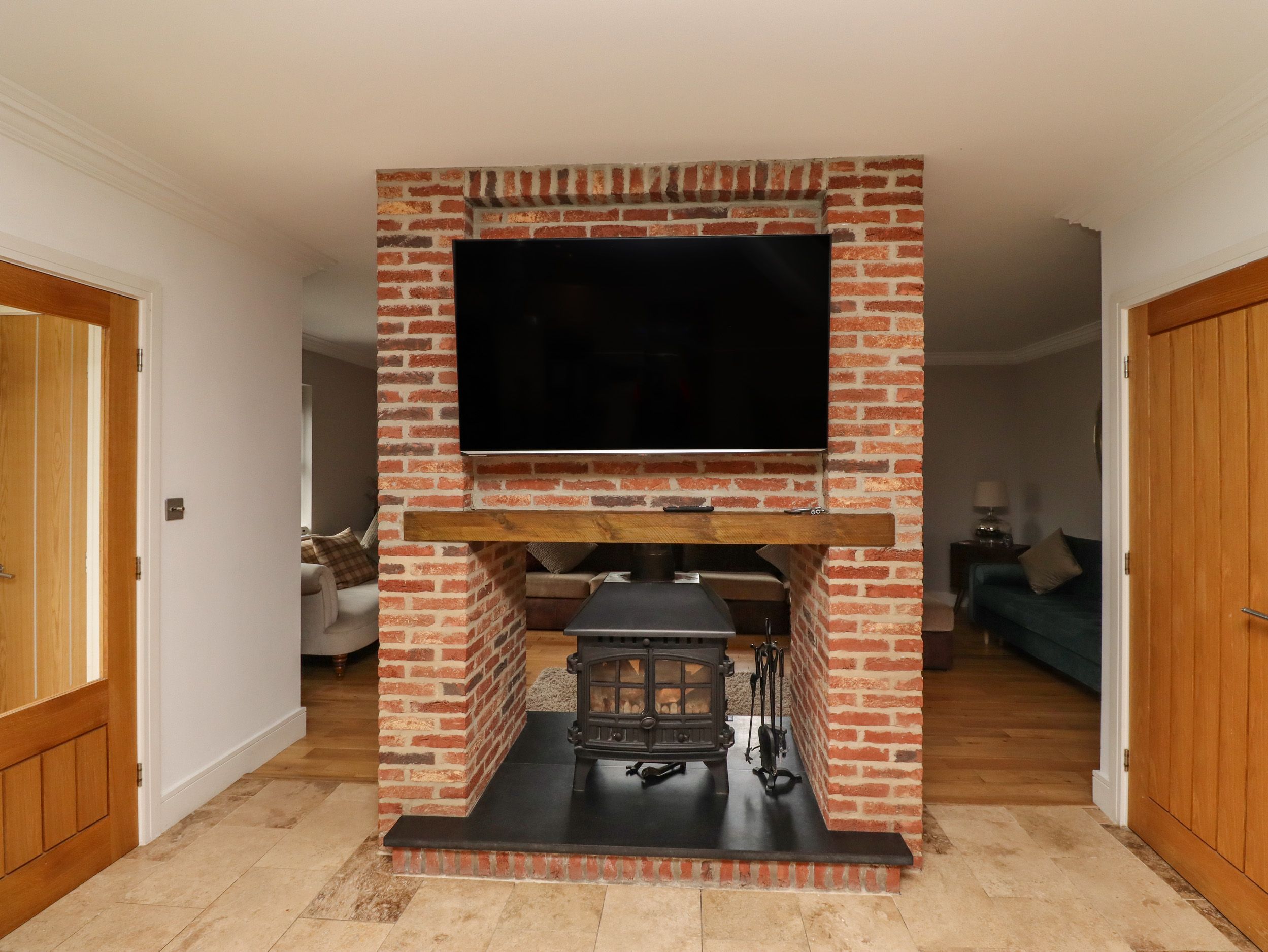 Lounge area with oak flooring, large sofas, wall mounted Smart TV, double sided wood burner stove.