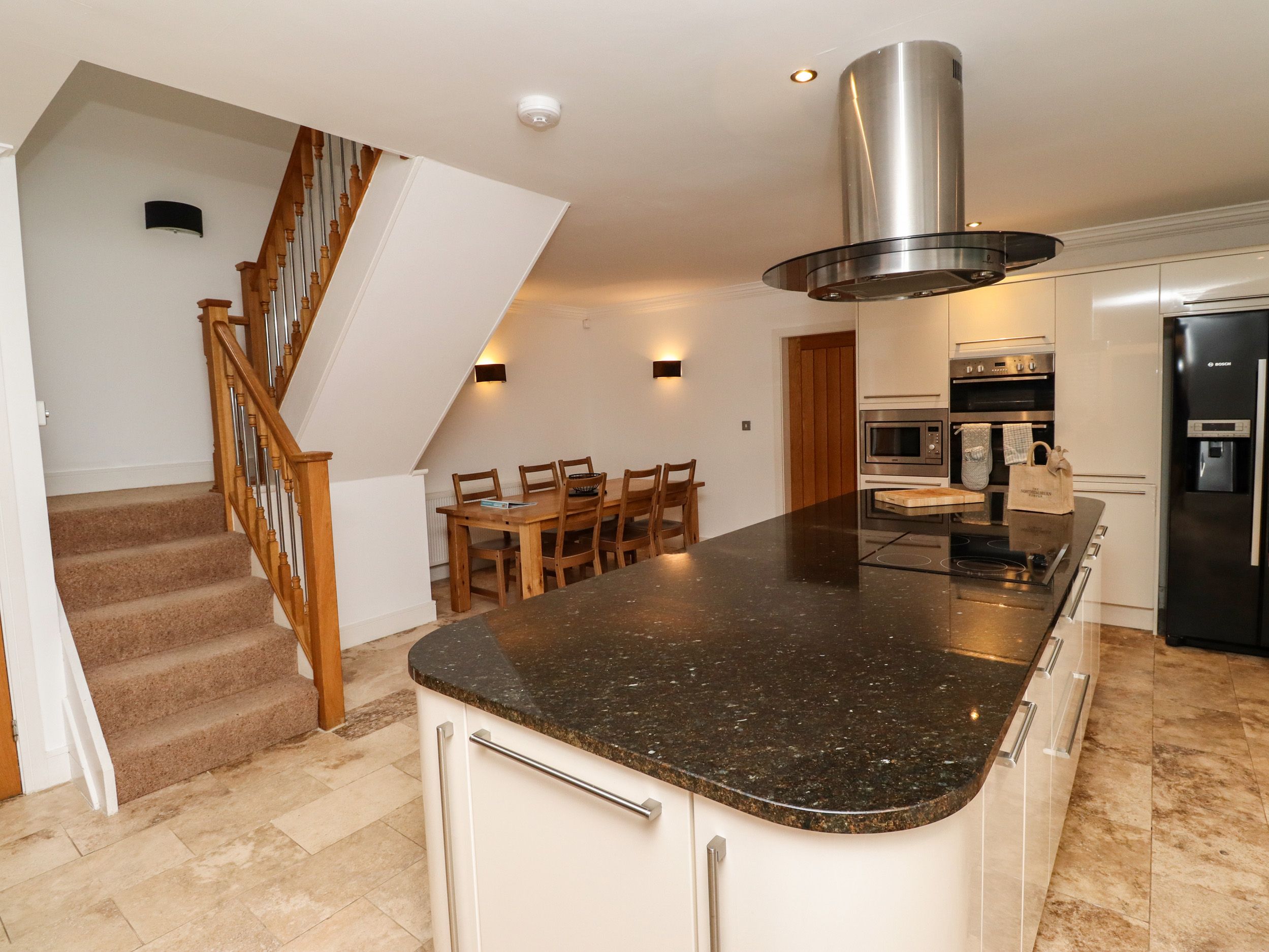 Kitchen/dining room/lounge with centre island and plenty of cupboards and granite work surfaces, four ring ceramic hob, electric double oven, American style fridge/freezer, integrated microwave, dishwasher and washing machine. Dining table, 4 chairs amp; bench, wall mounted Smart TV, double sided wood burner stove.