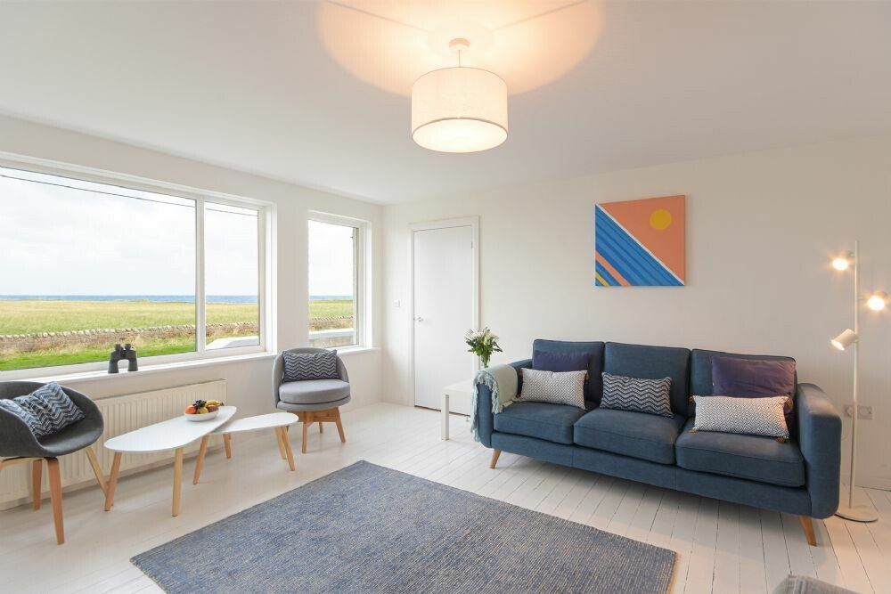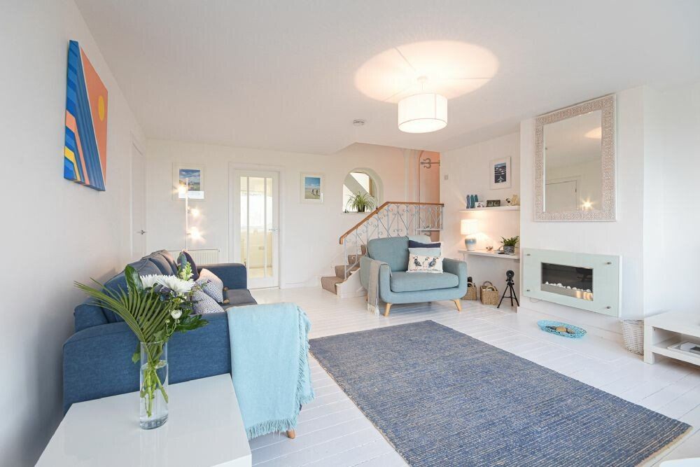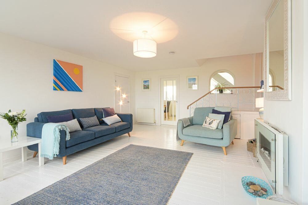 Large living room with an unspoilt view of the sea, ample comfy seating, TV, electric fire and wood flooring.