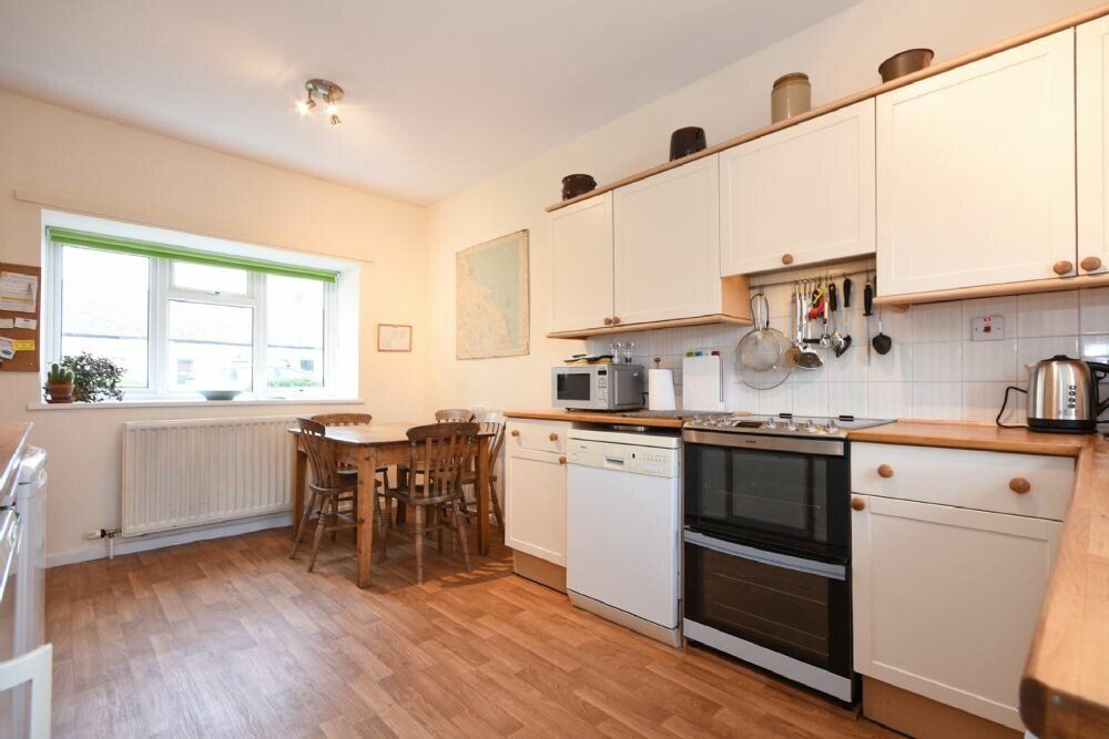 Kitchen with electric double oven and electric hob, fridge, freezer, dishwasher, washing machine and microwave.