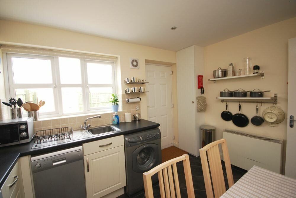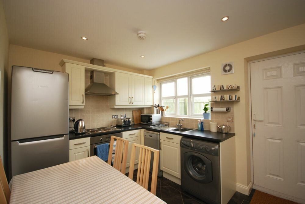 Kitchen/dining room with electric fan oven and hob, microwave, fridge/freezer, washing machine, dishwasher and dining table and chairs.