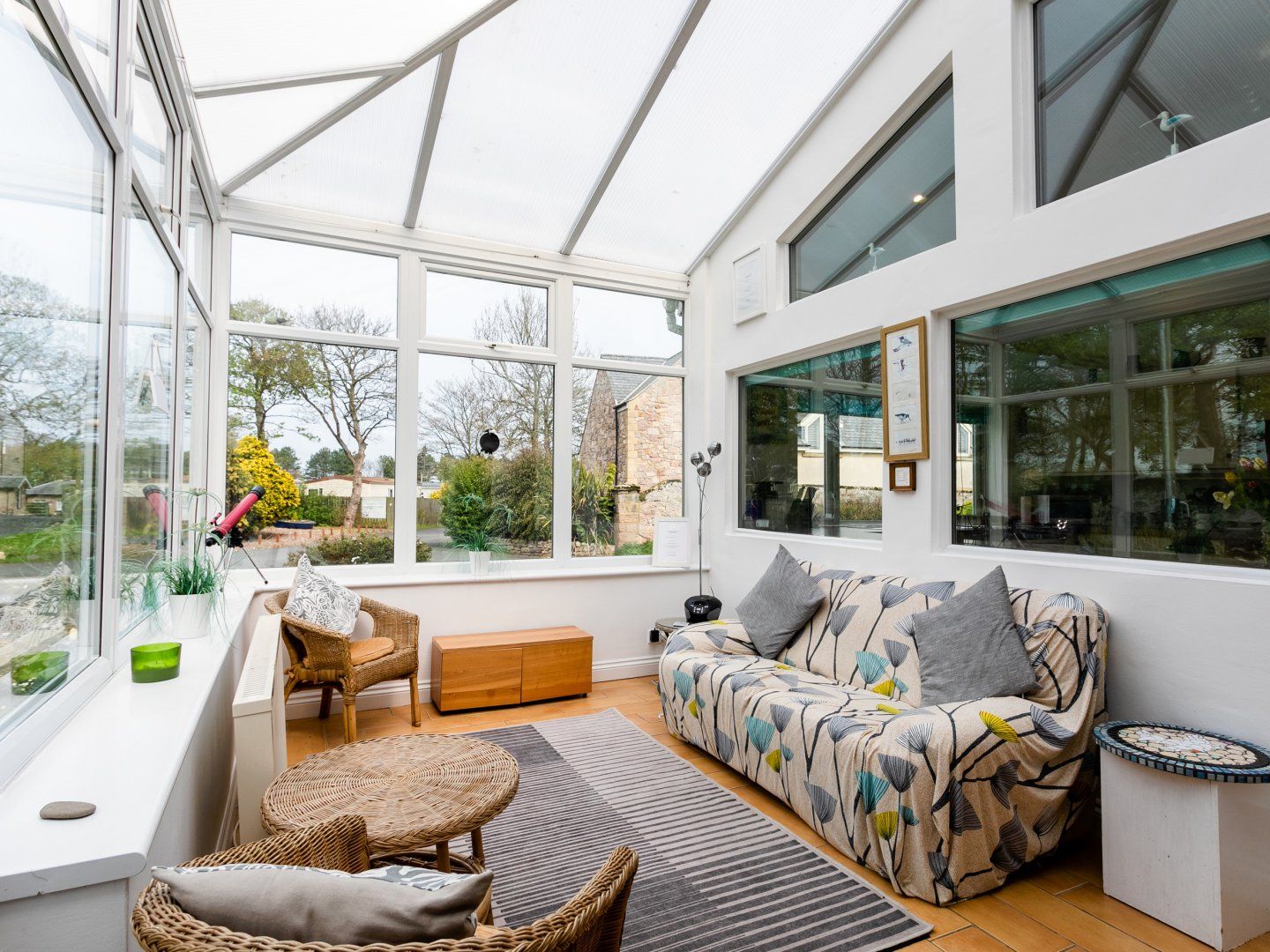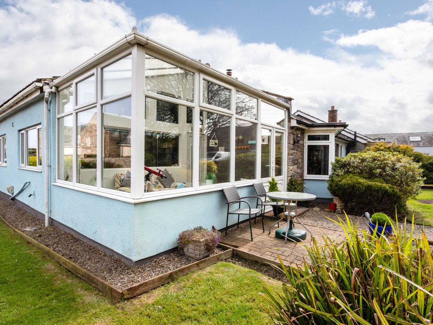 Conservatory with seating area and door onto garden.
