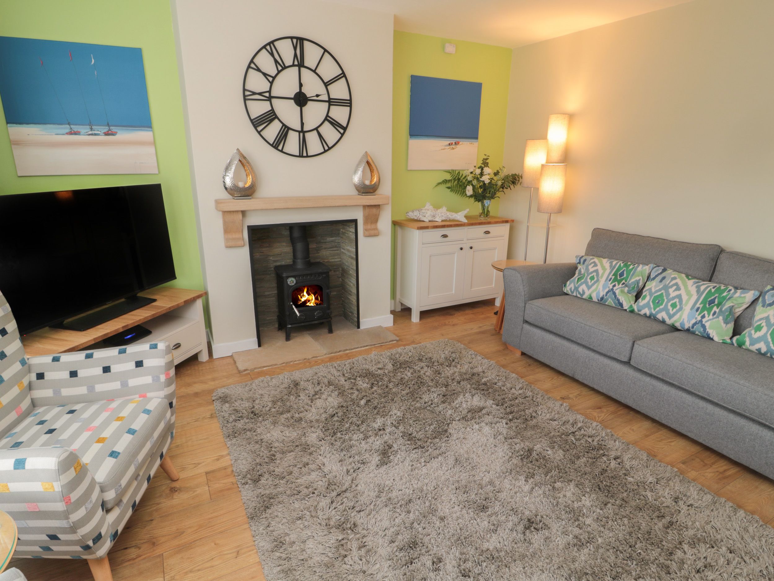 Amenities Central heating. Electric oven and hob, microwave, fridge/freezer, washing machine, dishwasher, wine chiller. Smart TV, TV, and WiFi. Fuel, power and starter pack for woodburning stove inc. in rent. Bed linen and towel inc. in rent. Off-road parking for 2 cars. Enclosed rear garden with gravel and furniture. Two well-behaved dogs are welcome. Sorry, no smoking. Shop 0.2 miles, pub 0.3 miles