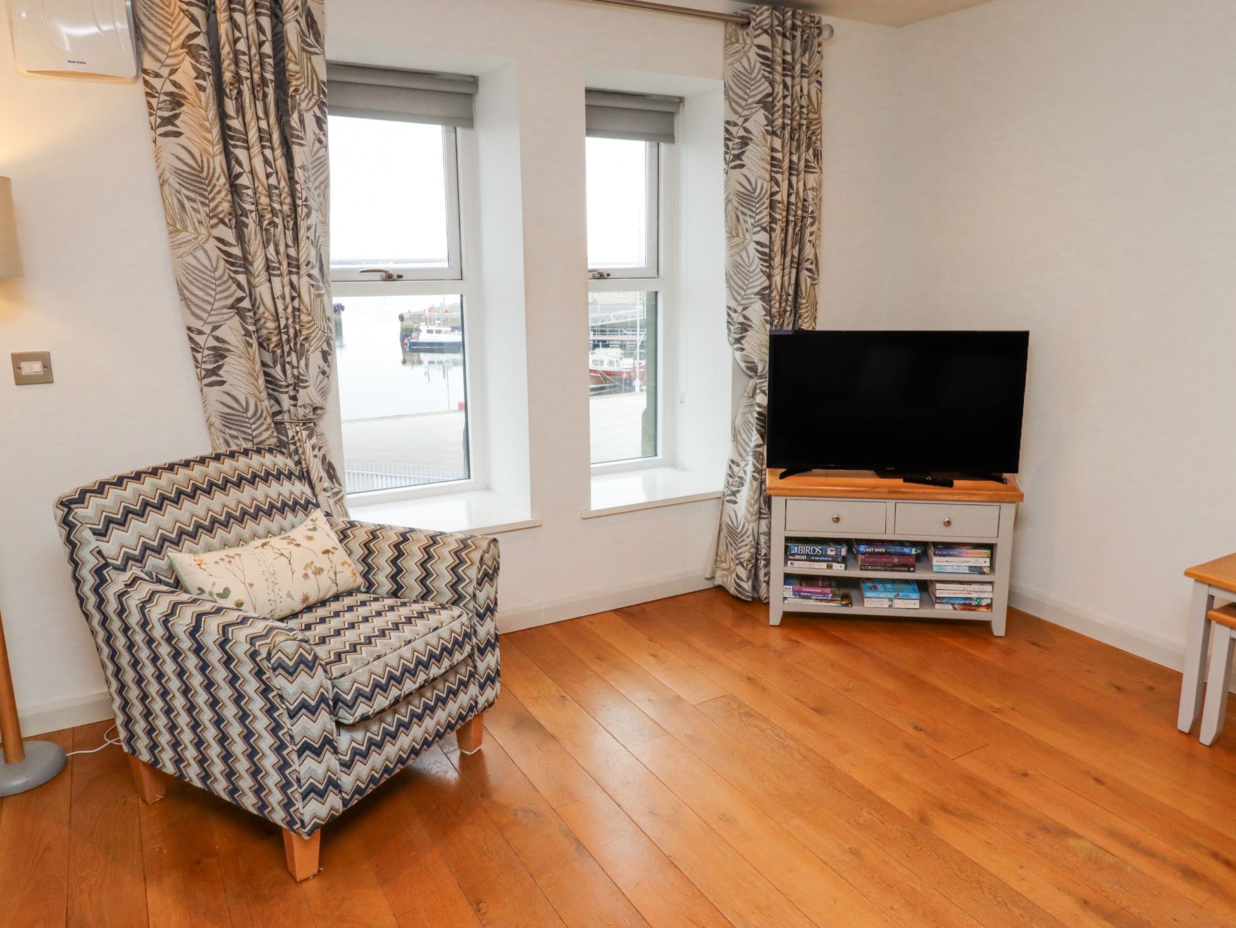 We had a lovely time here.. The owners were very helpful indeed, and left a lovely welcome pack. Everything was exactly as shown here. How marvellous to find a place with sharp knives ! The view over the harbour was fab, and changed all the time. There is a TV but we never even turned it on the whole time we were there.