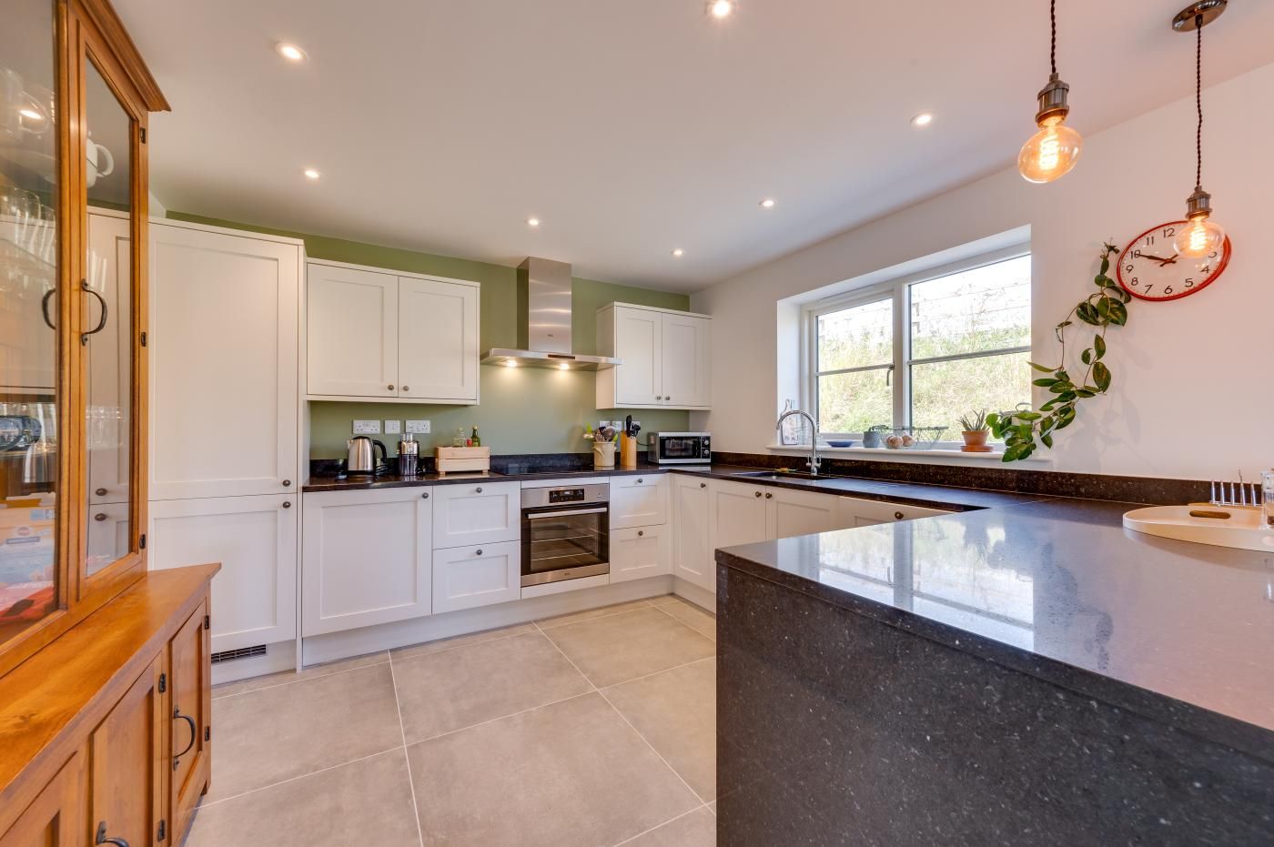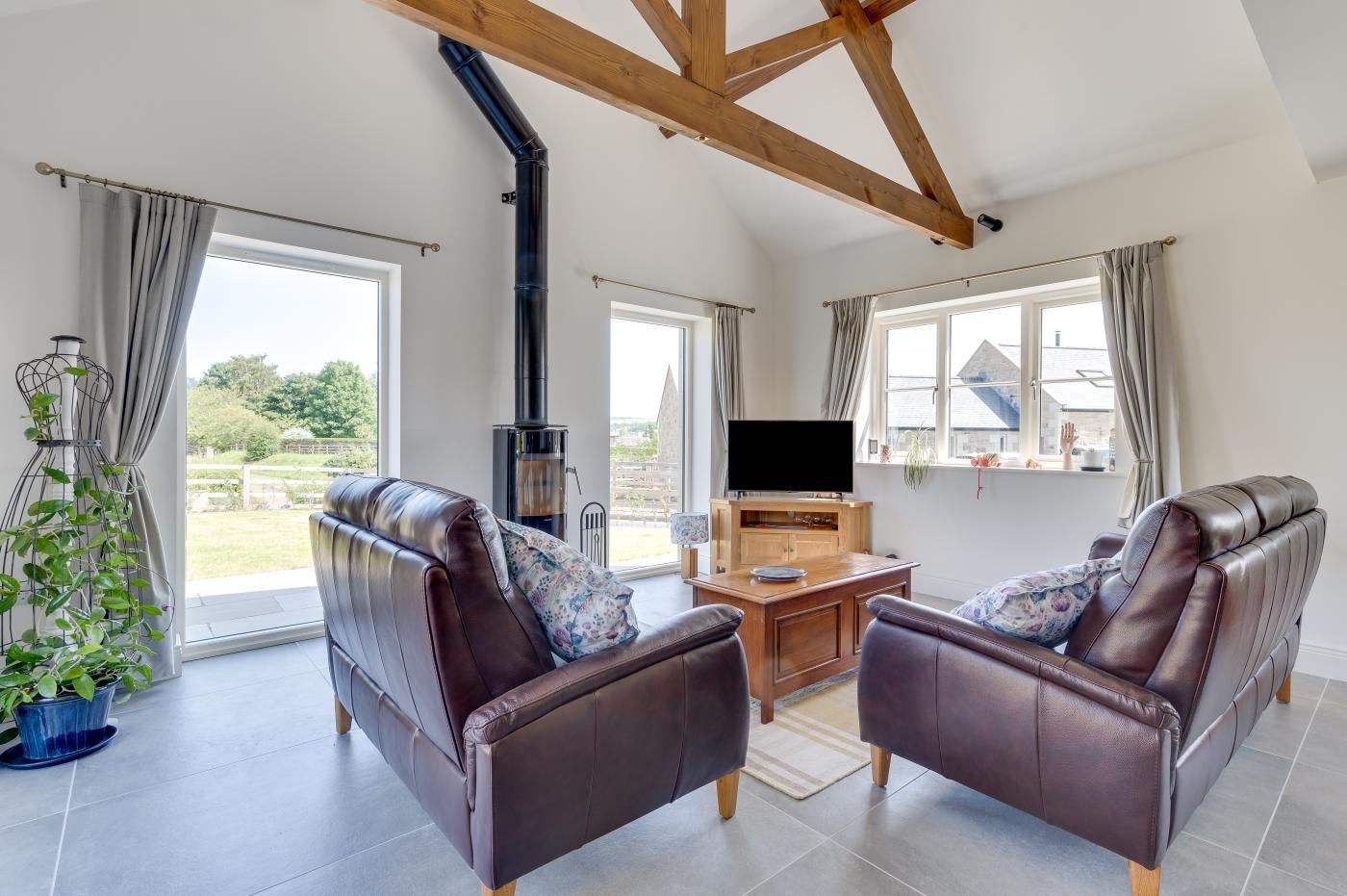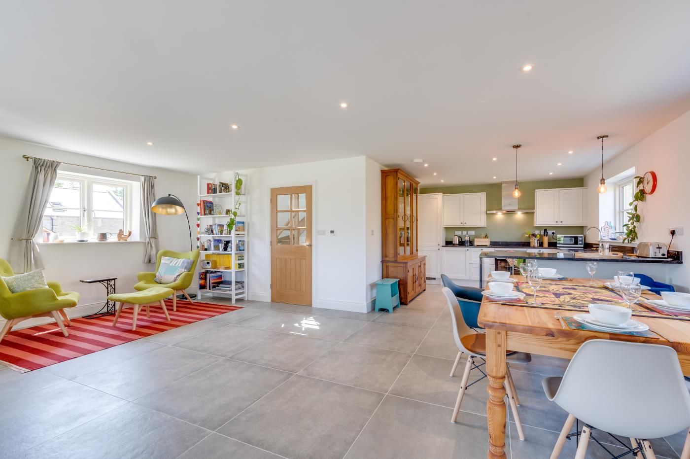 The open plan lounge/dining room is light and airy with a double height ceiling featuring exposed A line beams. At the end of the lounge, there are two full length east facing windows, which allow the morning sunlight to flood in, and between the windows is a wall hung log burning stove.