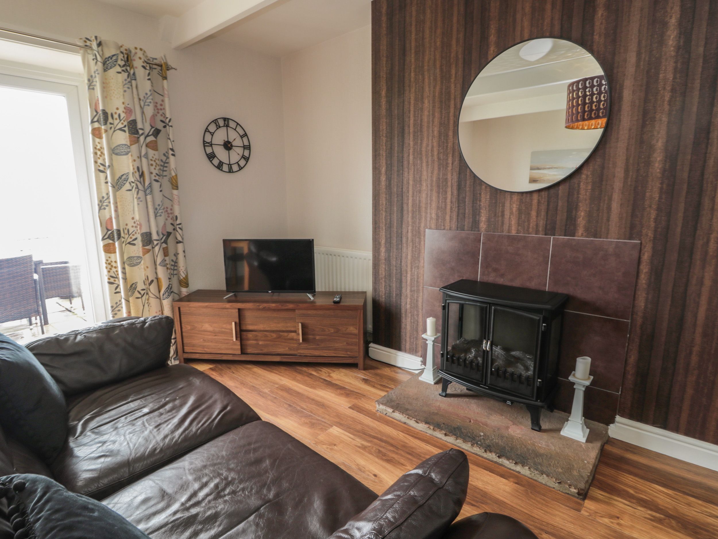 Living/dining room with electric flame effect fire, Smart TV with Netflix and sea views.