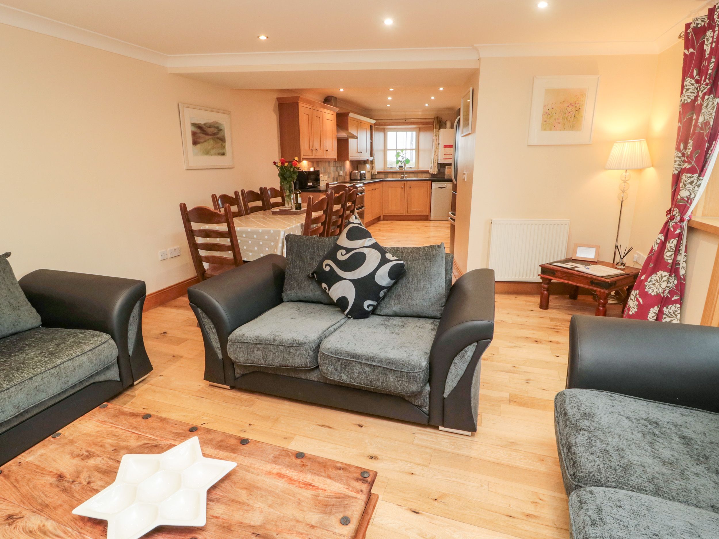 Accomodation Details Four bedrooms: 1 x ground floor super king-size double with en-suite bath, hand-held shower, basin and WC, 1 x double with TV and en-suite shower, basin and WC leading to 1 x twin, 1 x twin with en-suite shower, basin and WC. Open plan living area with kitchen, dining area and sitting area with woodburner. Understairs cupboard housing washing machine. Shared play area on cottage complex.
