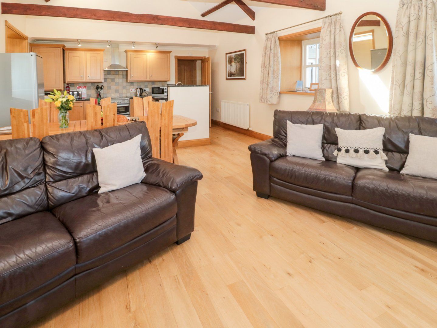 Accomodation Details Three bedrooms: 2 x ground-floor king-size, 1 x twin. 1 x ground-floor bathroom with bath, shower over, basin and WC. Bathroom with bath, separate shower, basin, heated towel tail, and WC. Open-plan living space with a kitchen, dining area, and a sitting room with a woodburning stove Shared play area on cottage complex.