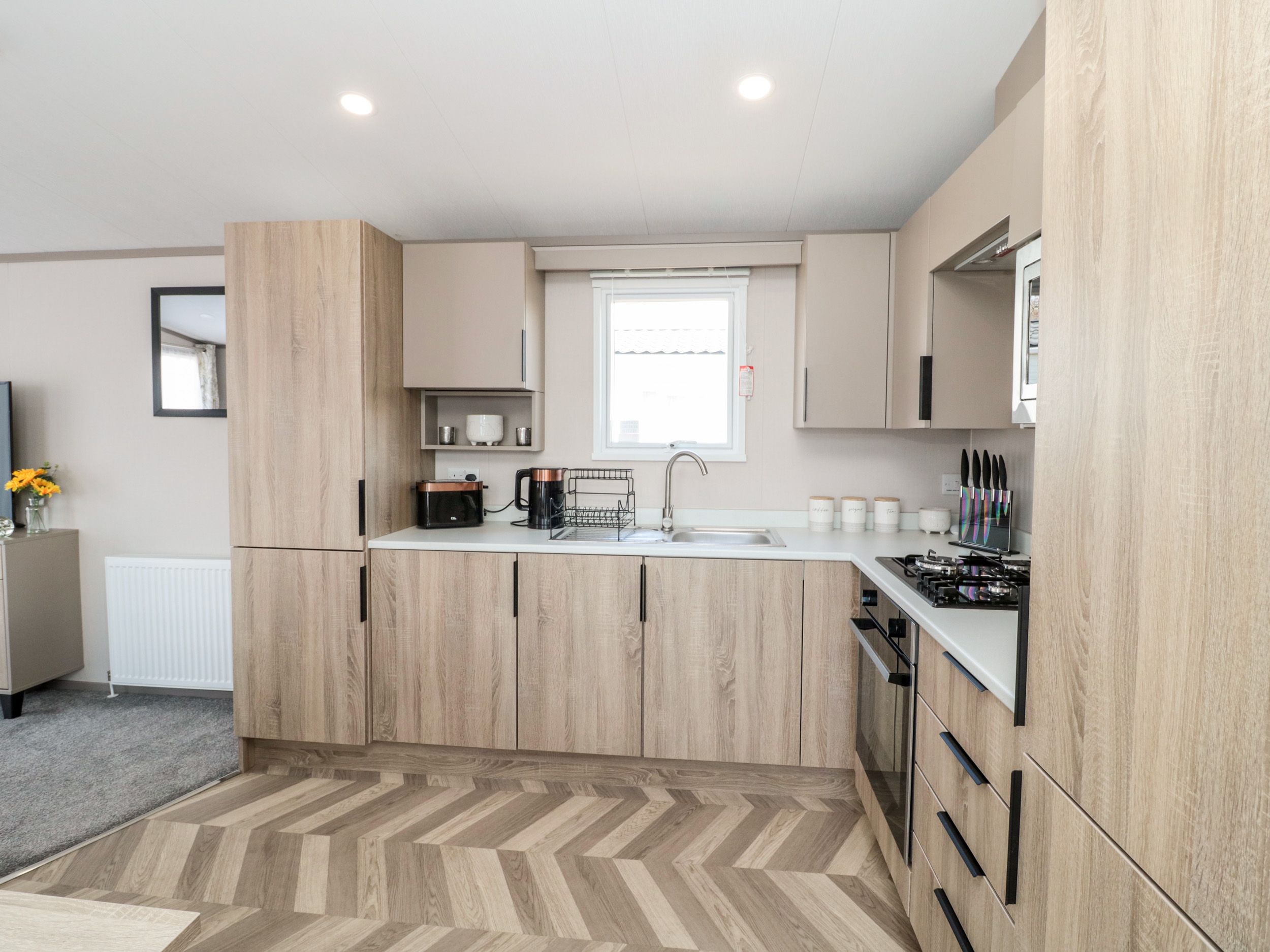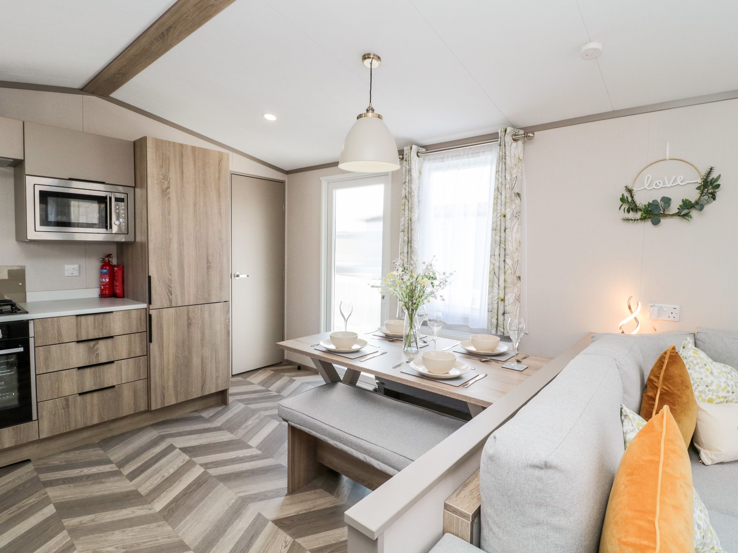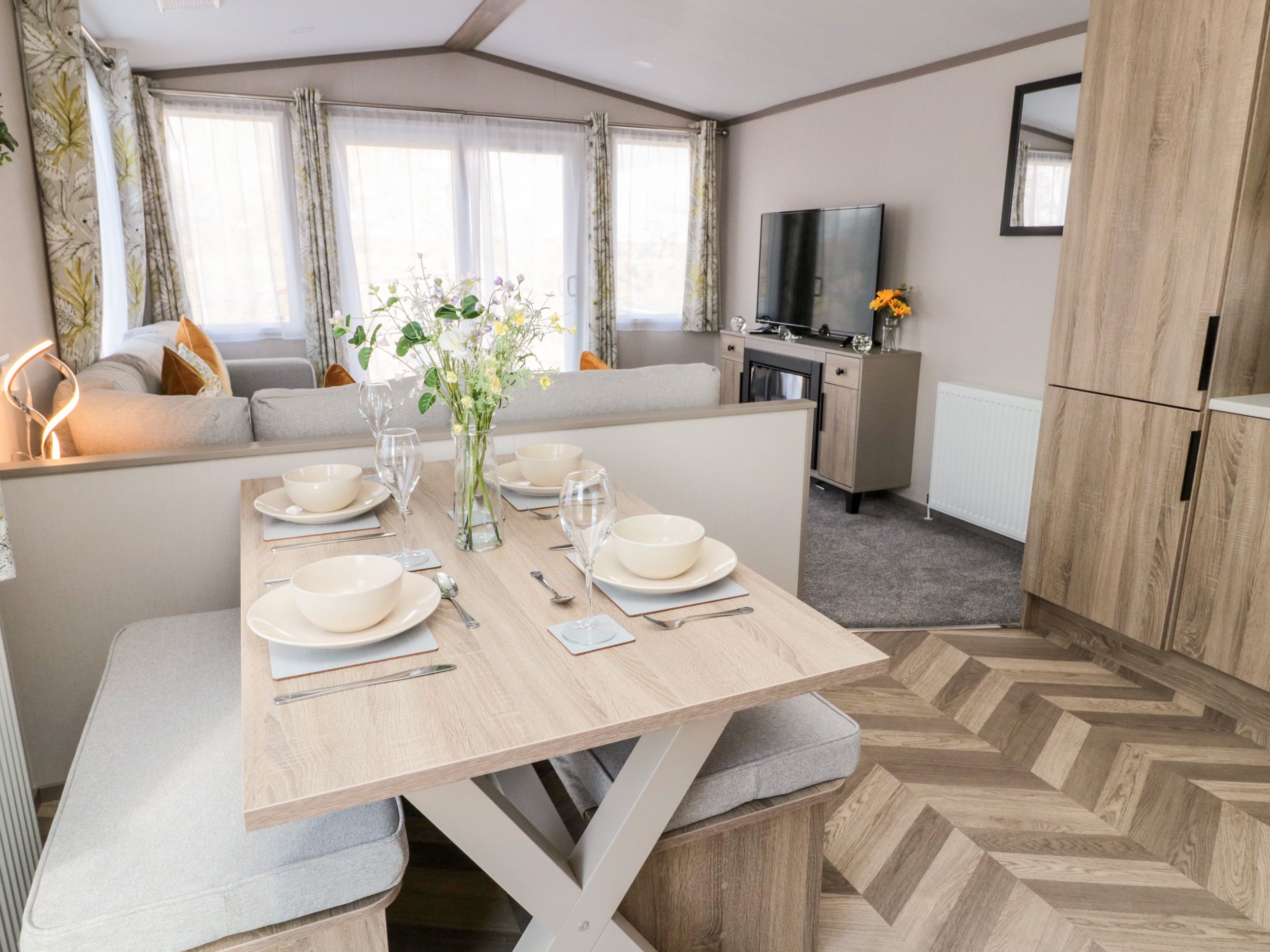 Amenities Central heating with electric fire. Electric oven, gas hob, microwave, fridge/freezer. 3 x Smart TV, DVD player, WiFi. Fuel and power inc. in rent. Bed linen and towels inc. in rent. Highchair and travel cot available on request. Off-road parking for 1 car. Decking with hot tub, gas barbecue, furniture and storage. Two well-behaved dogs welcome. Sorry, no smoking. Shop 2.3 miles, pub 0.1 miles. Note: There are steps up to the property entrance. Note: Guests have access to an on-site bar and children's play area. Note: Guests can have additional parking for up to two vehicles on the park if needed. Note: No stag, hen, or similar parties. Note: The park has quiet times between 10pm and 8am. Note: The changeover days for this property are a Friday and a Monday.