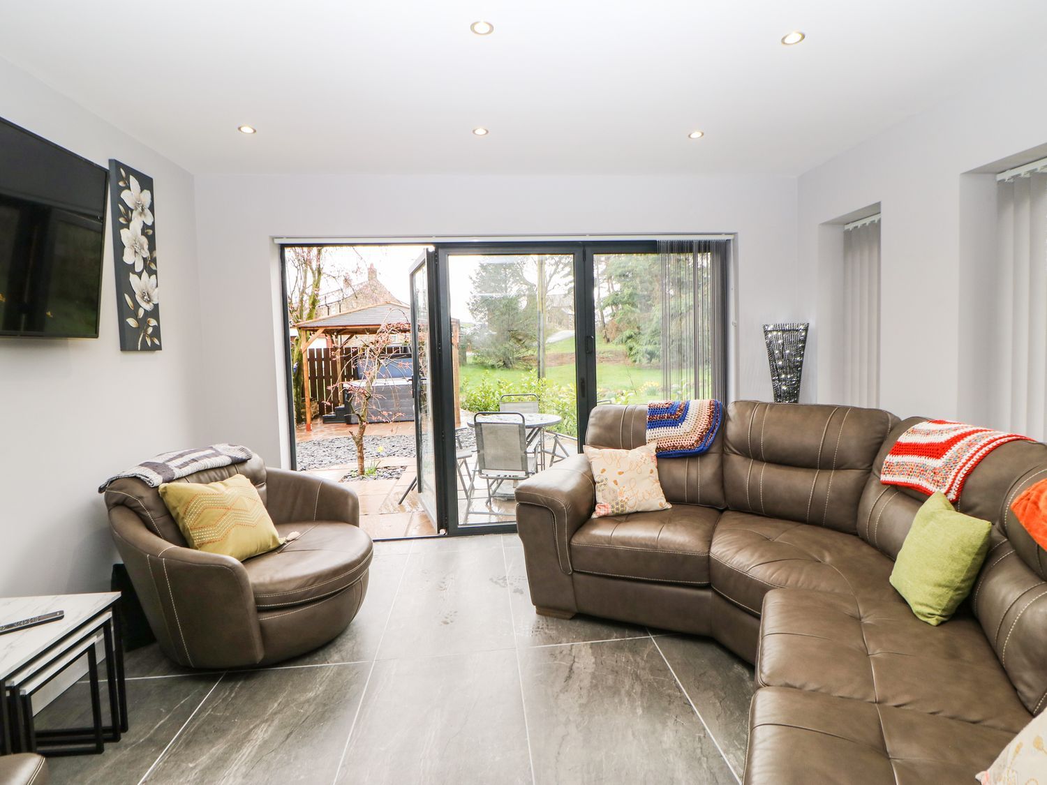 Holiday home Stoney Wall consists of an open-plan living space including a kitchen with an electric oven and hob, microwave, fridge/freezer, washing machine, a dining area, and a sitting area with TV and sofa bed. The bedroom consists of a king-size with en-suite bath, plus ground-floor shower room. Outside, there is a rear garden with patio, gravelled area, furniture, and hot tub, along with an allocated, off-road parking for one car. Sorry, no pets and no smoking. Shop 4.2 miles, pub 0.7 miles. WiFi, fuel, power, bed linen and towels are all included in the price. Relax and unwind in the countryside with a stay at Stoney Wall. Note: The hot tub might not be ready on the day of arrival due to cleaning. Note: This property can not accommodate a Thursday arrival. Note: This property allows a Friday check-in , to stay a full week it is a Sunday check-in only.