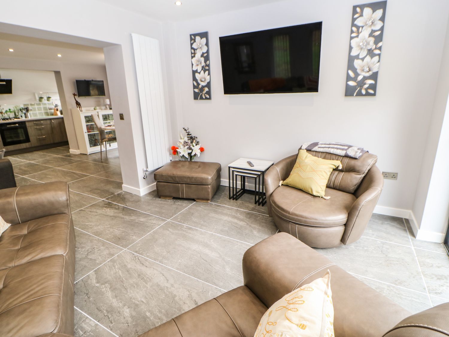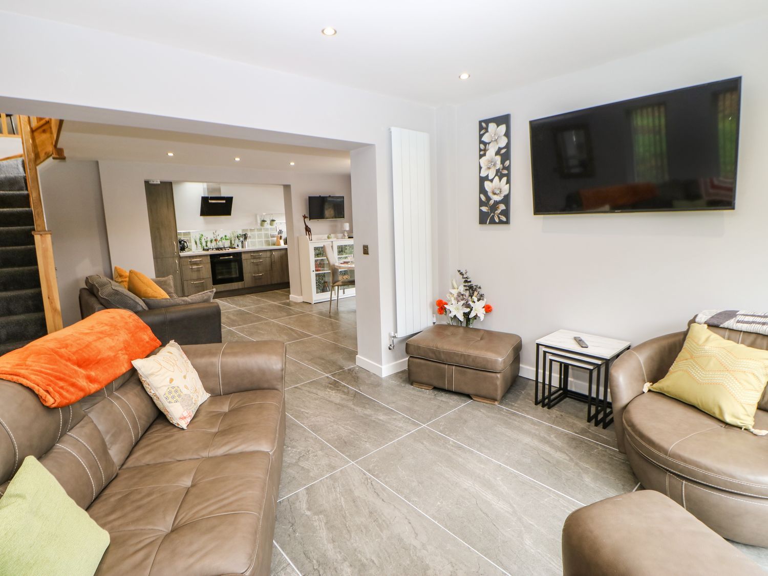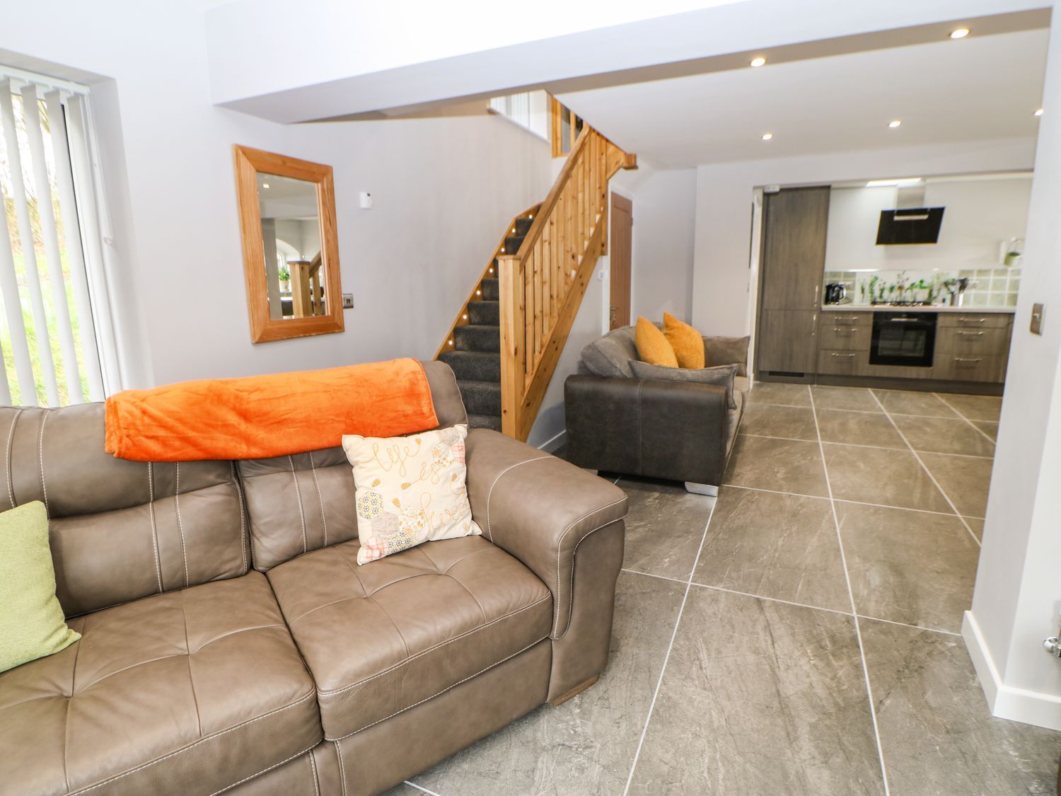 Accomodation Details One king-size bedroom with en-suite corner bath, basin, heated towel rail, and WC. Ground-floor shower room with walk-in shower, basin, heated towel rail, and WC. Open-plan living space with kitchen, dining area, and sitting area with sofa bed