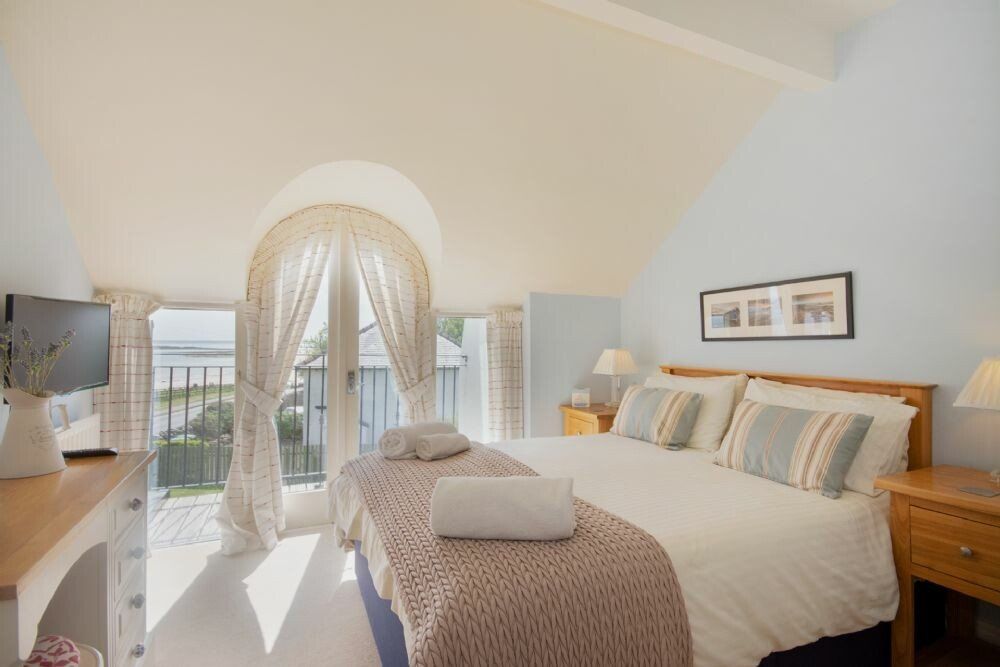 Bedroom 1 with King size bed, dressing table, wardrobe, balcony and sea views. Step up to en-suite with shower cubicle, WC, wash hand basin and heated towel rail.