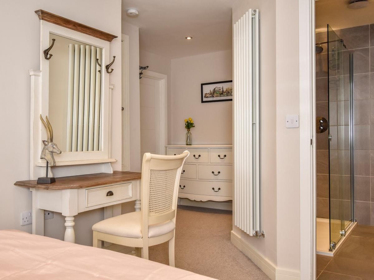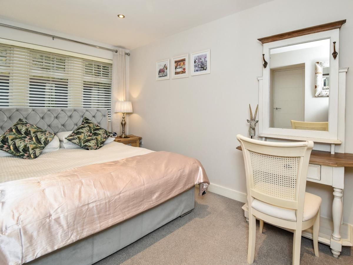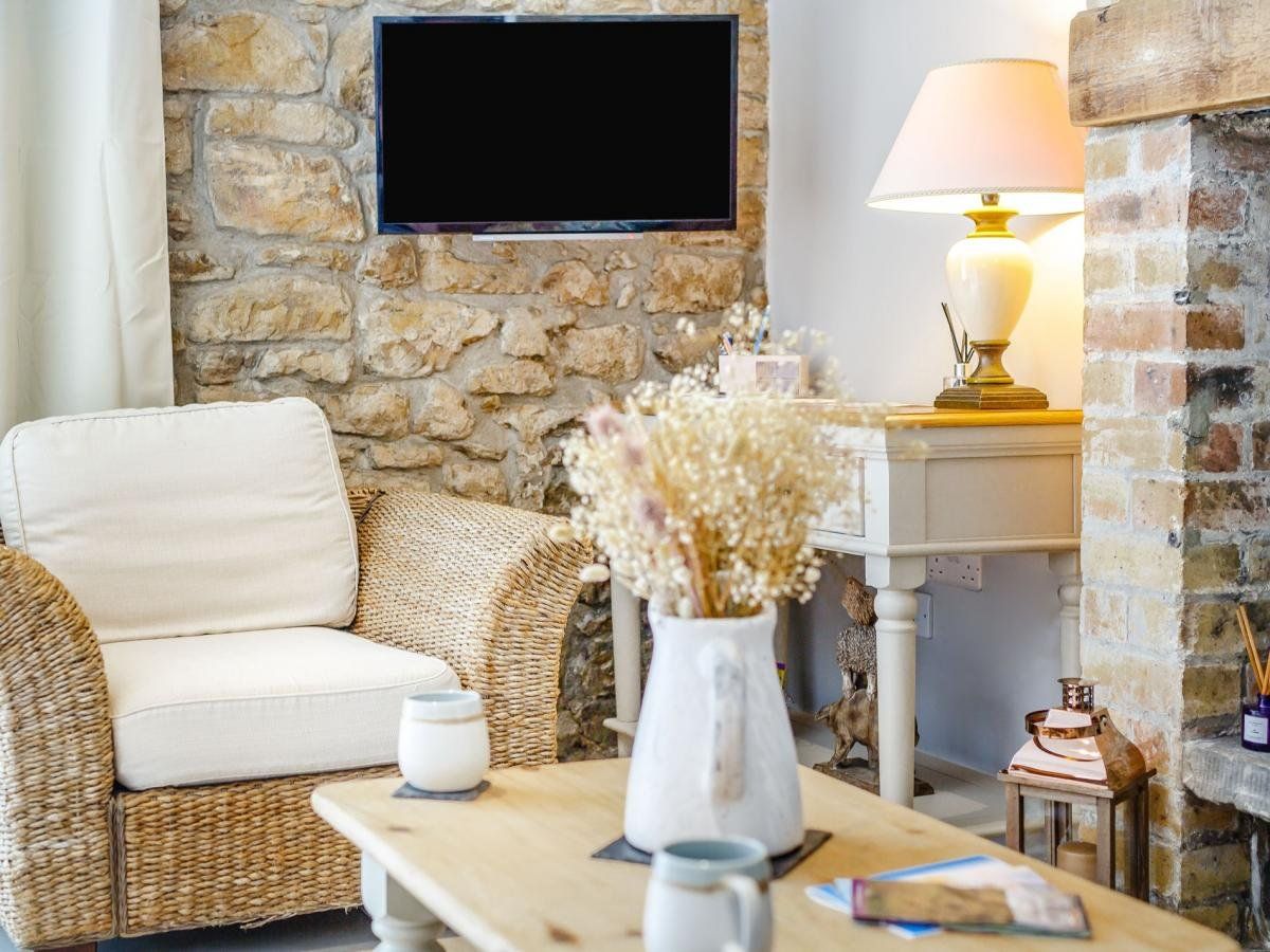 This ground-floor apartment has a distinctly country-cottage feel where homely touches sit alongside feature stone walls and exposed wooden beams. The welcoming open-plan living space is made all the more cosy with the addition of an electric flame-effect fire housed within a stone fireplace.