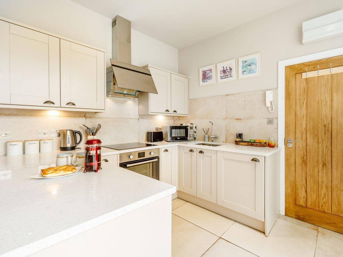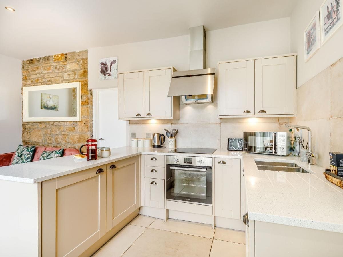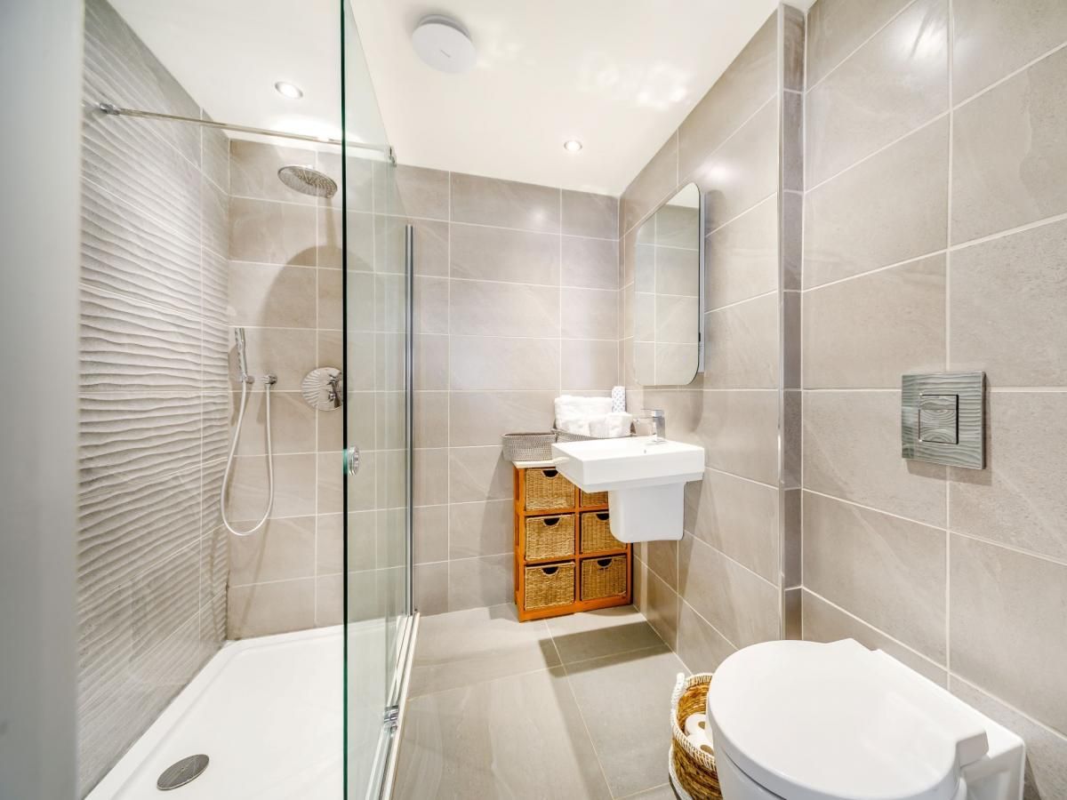 This ground-floor apartment has a distinctly country-cottage feel where homely touches sit alongside feature stone walls and exposed wooden beams. The welcoming open-plan living space is made all the more cosy with the addition of an electric flame-effect fire housed within a stone fireplace.